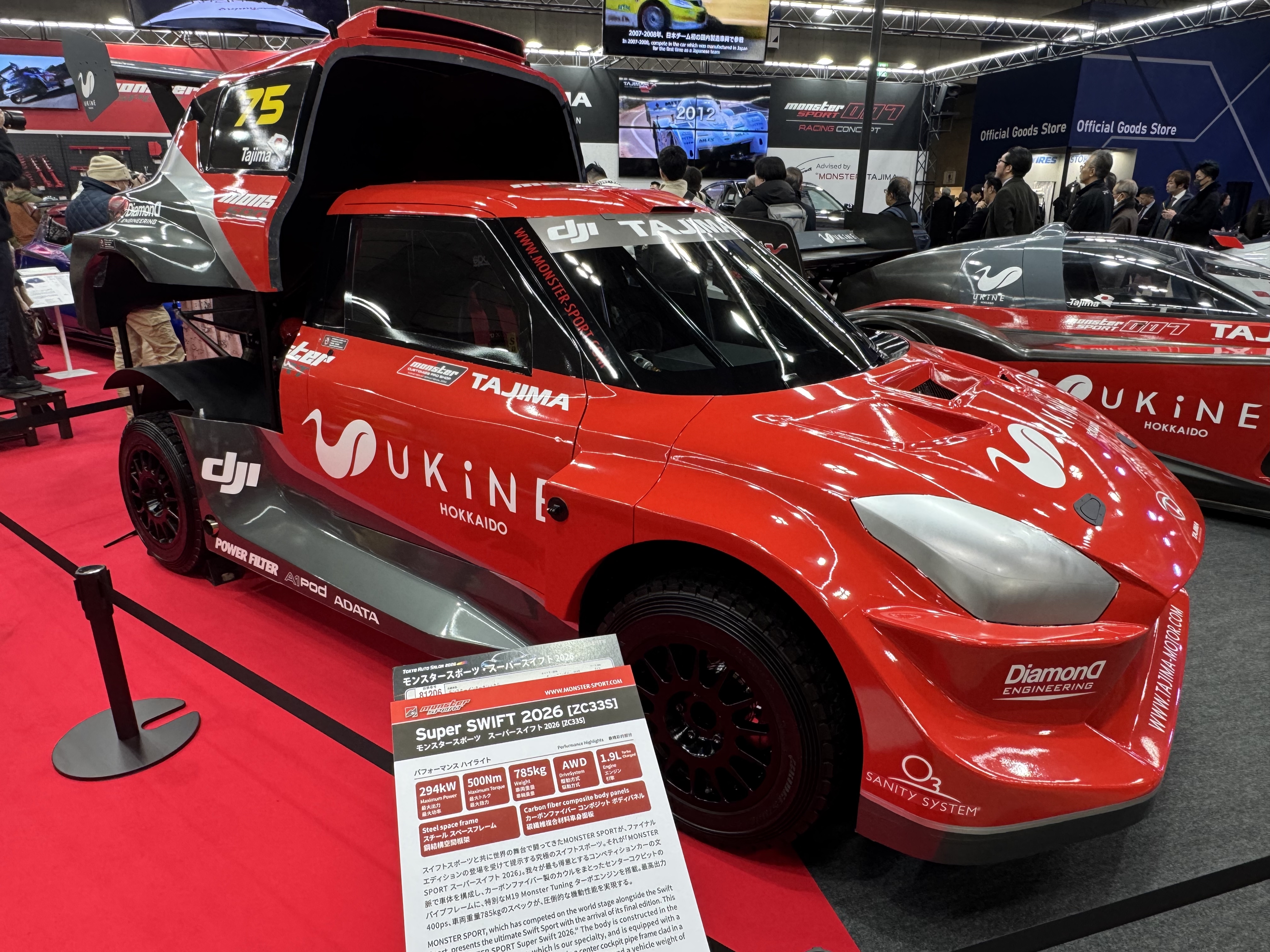 こうした思想をより多くの人に伝えるため、UKiNEは2026年1月10日~11日「幕張メッセ」で開催された「TOKYO AUTO SALON 2026」にて、タジマモーターズのMONSTER SPORTスーパースイフト2026の車両とスポンサード契約を締結。