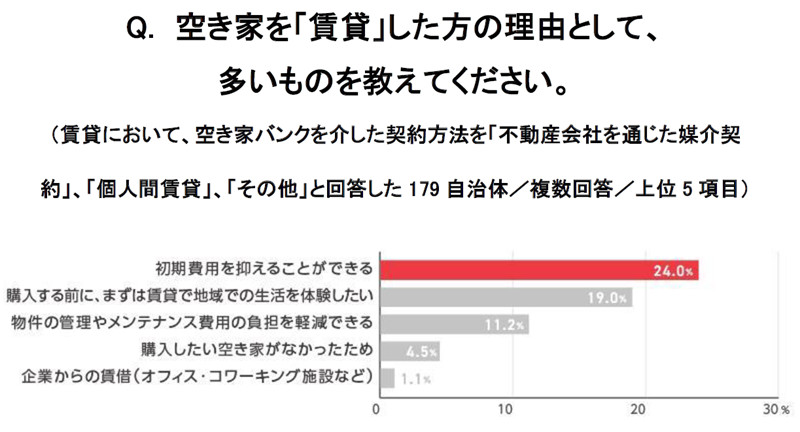 空き家を購入した方の理由は、「自然豊かな環境での生活を目的とした購入」が最も多く、次いで「Iターン」、「同一市区町村内での住替え」が続きました。また、空き家を賃貸した方の理由では、「初期費用を抑えることができる」が最多。その他には「購入する前に、まずは賃貸で地域での生活を体験したい」などの回答がありました。