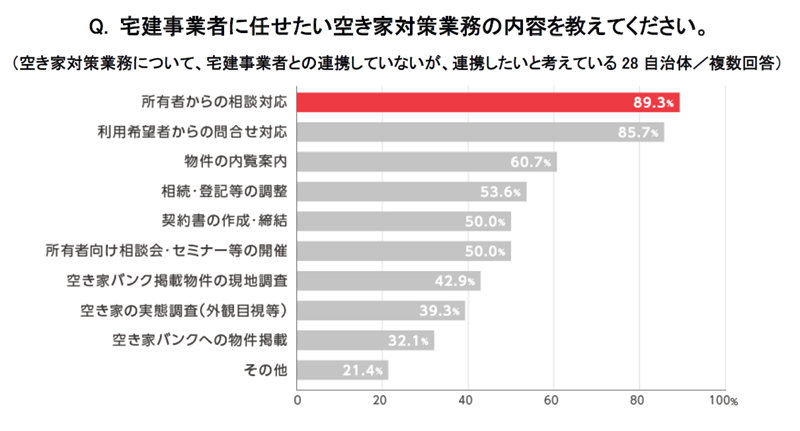 自治体が宅建事業者に任せたい空き家業務は、「所有者からの相談対応」がトップ。次いで、「利用希望者からの問合せ対応」、「物件の内覧案内」が続きました。