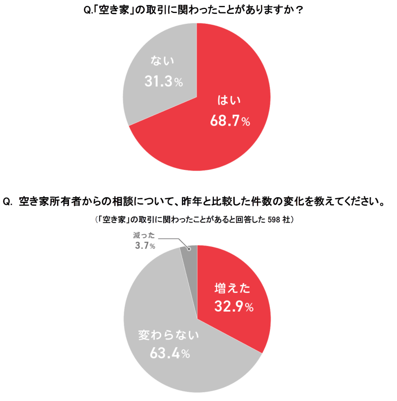 「空き家取引に関わったことがある」と回答した不動産会社は68.7%。また、空き家所有者からの相談件数については、「増えた」という回答が32.9%でした。