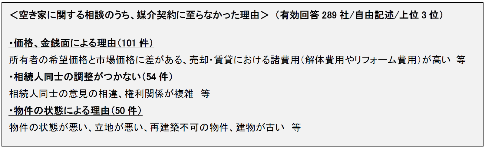 空き家に関する相談から媒介契約に至らなかった理由は、「価格、金銭面による理由」が最多。その他、「相続人同士の調整がつかない」、「物件の状態による理由」など、さまざまな要因が挙げられました。