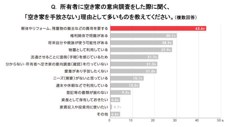 空き家所有者が空き家を手放さない理由は、「解体やリフォーム、残置物の撤去などの費用を要する」が43.4%と最多。次いで、「権利関係で問題がある」、「将来自分や親族が使う可能性がある」などが挙げられました。