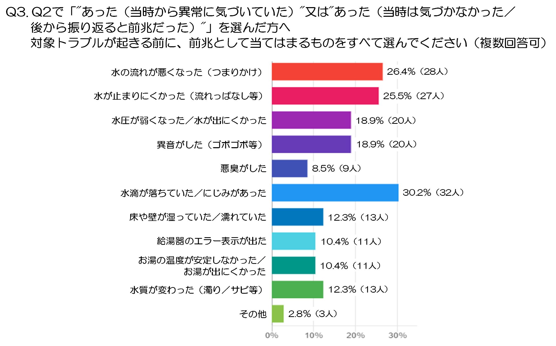 また、「水圧が弱くなった/水が出にくくなった」18.9%(20人)、「異音がした(ゴボゴボ等)」18.9%(20人)も同程度の割合となっています。音や勢いの変化は感覚的な違和感として認識されるものの、原因が分かりにくいため、そのまま様子見をしてしまう人も少なくない様子がうかがえます。