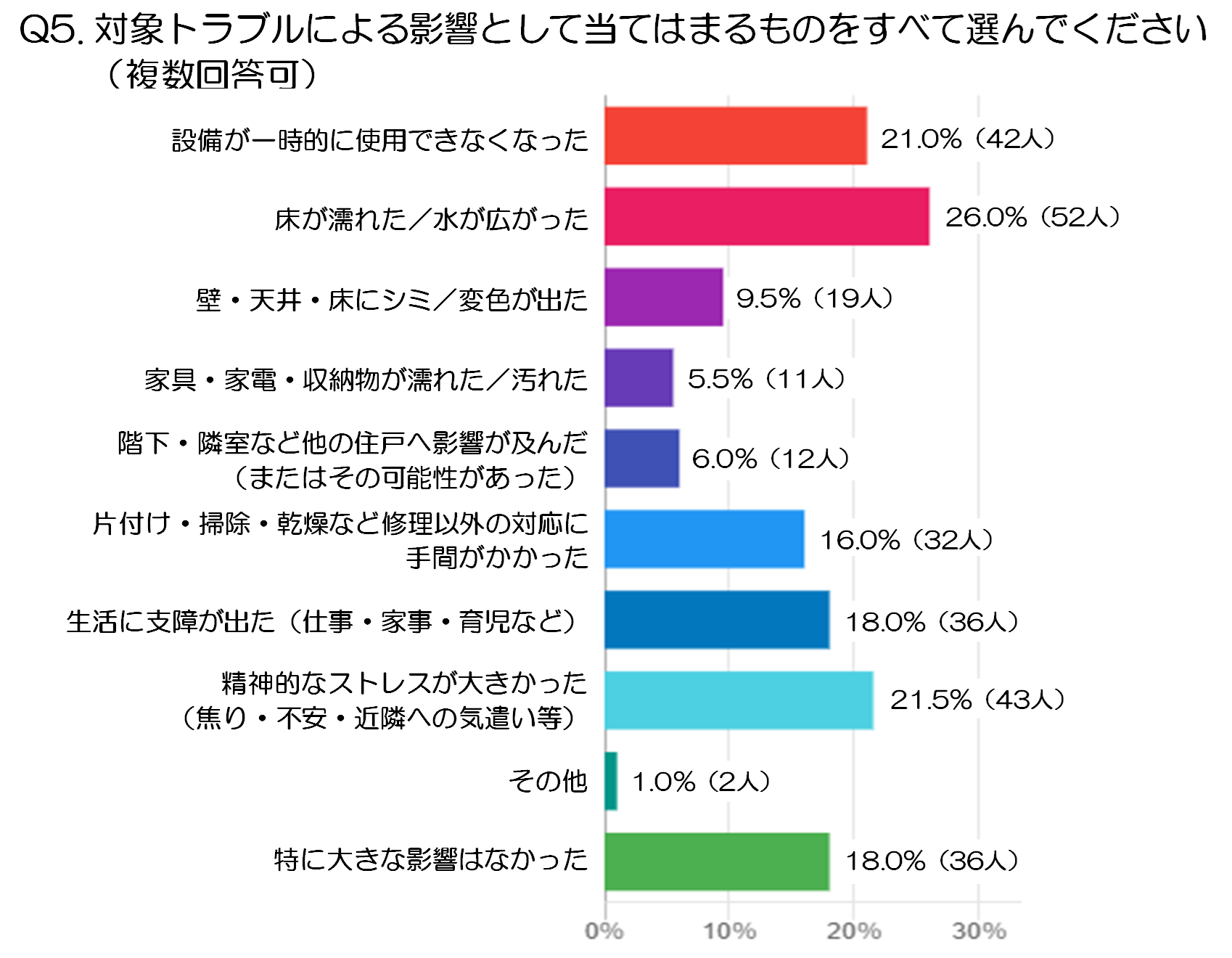 次いで多かったのが「精神的なストレスが大きかった(焦り・不安・近隣への気遣い等)」で、21.5%(43人)となっています。水回りトラブルは単なる設備不良にとどまらず、「このまま被害が広がったらどうしよう」「周囲に迷惑をかけていないか」といった心理的負担につながりやすいことがうかがえます。