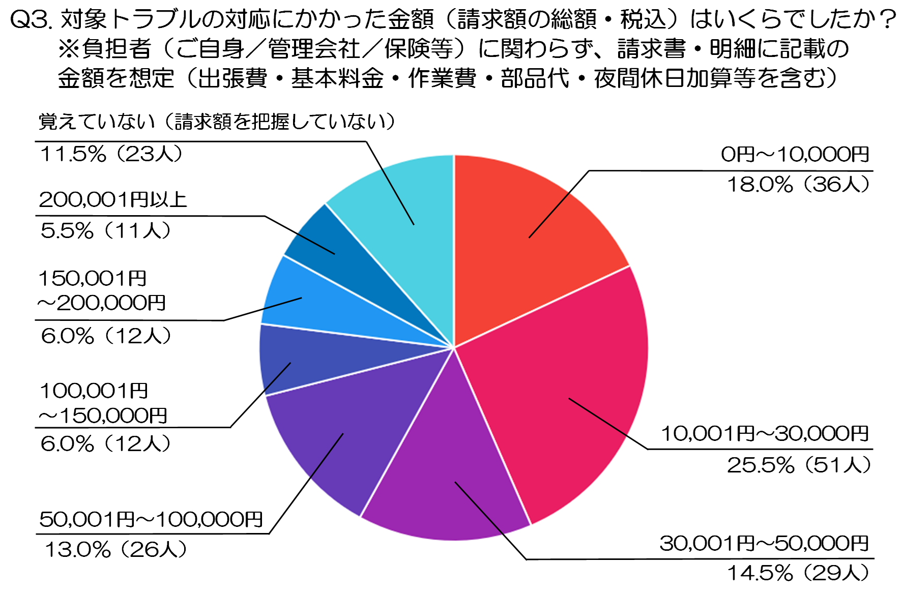 次いで多いのが「0円〜10,000円」18.0%(36人)で、簡単な調整や短時間の作業で解決したケースでは、比較的少額で済んでいる様子も見て取れます。