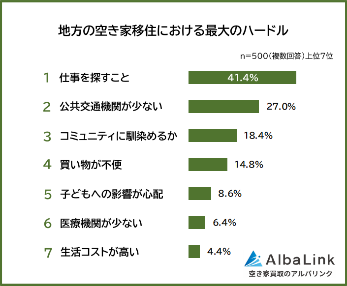 「地方の空き家移住で最大のハードル」を聞いたところ、ダントツは「仕事を探すこと(41.4%)」でした。次ぐ2位は「公共交通機関が少ない(27.0%)」、3位「コミュニティに馴染めるか(18.4%)」、4位「買い物が不便(14.8%)」が続きます。