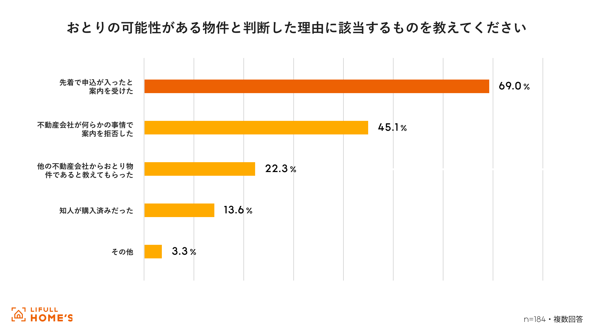 おとり物件に遭遇したと判断した理由として最も多かったのは、「先着で申込が入ったと案内を受けた(69.0%)」でした。次いで、「不動産会社が何らかの事情で案内を拒否した(45.1%)」となっています。消費者が物件情報を閲覧した段階では取引可否が判断できず、実際に不動産会社へ問い合わせを行った後になって、初めて状況が判明するケースが多いことがうかがえます。