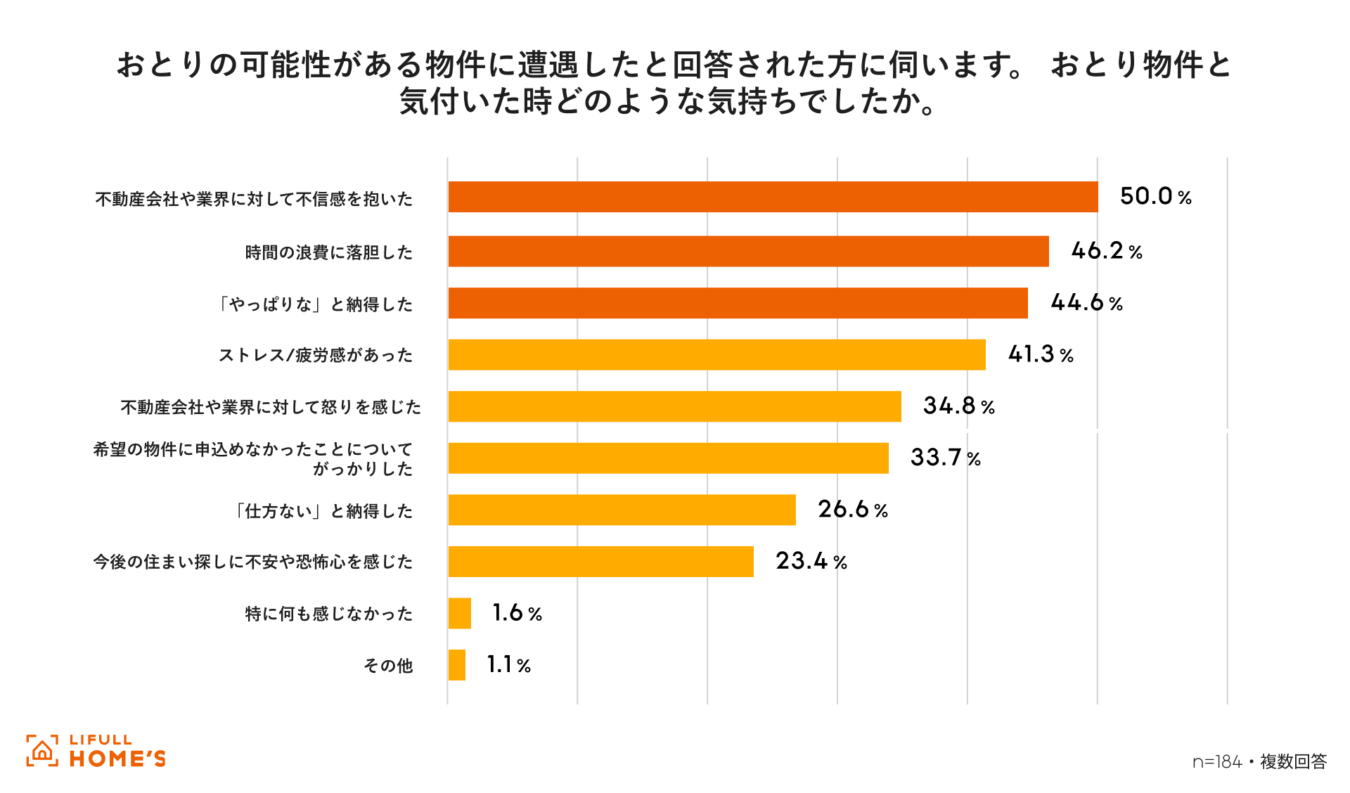 おとり物件に気づいた際の気持ちとしては、「希望の住まいに申し込めなかった」という結果そのものよりも、「不動産会社や業界に対して不信感を抱いた(50.0%)」「時間の浪費に落胆し」「やっぱりなと納得した(44.6%)」といった、業界全体に対する不信感を示す回答が多く見られました。単なる機会損失にとどまらず、住まい探しへの信頼感そのものが損なわれていることがうかがえます。