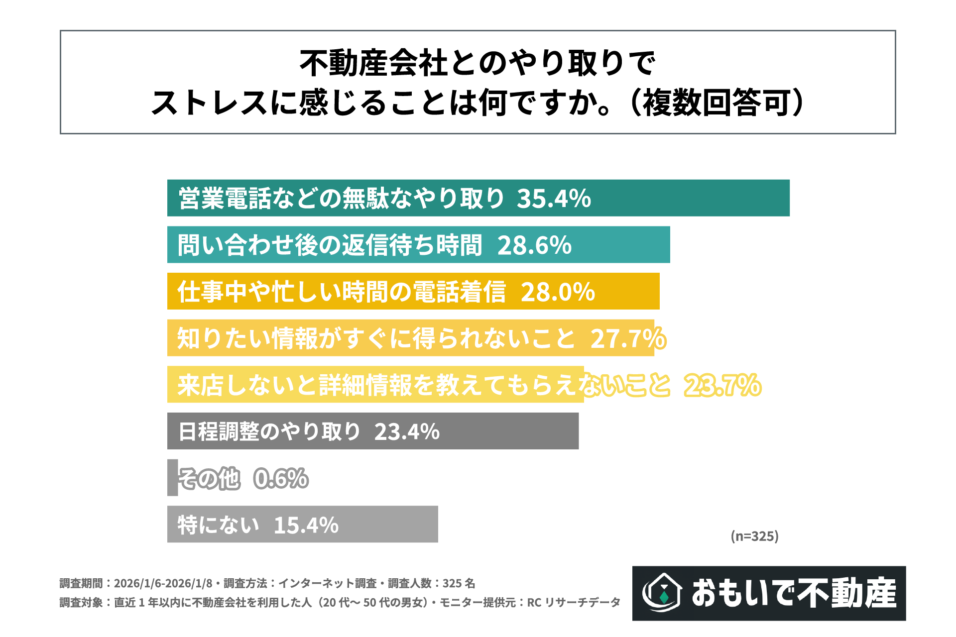 調査の最後、直近1年以内に不動産会社を利用した人を対象に「不動産会社とのやり取りでストレスに感じることは何か」を尋ねる設問への回答では、1位が「営業電話などの無駄なやり取り」で35.4%、2位が「問い合わせ後の返信待ち時間」で28.6%、3位が「仕事中や忙しい時間の電話着信」で28.0%という結果になりました。この結果から、不動産会社とのやり取りにおいて「営業電話などの無駄なやり取り」や「仕事中や忙しい時間の電話着信」といった電話連絡に加え、「問い合わせ後の返信待ち時間」などにストレスを感じていることがわかりました。