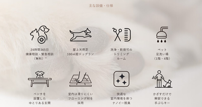 共用施設には天然芝のドッグランやトリミングルームを備え、各住戸にはペットに配慮したフローリングや壁クロス、ナノイー発生器を採用しました。