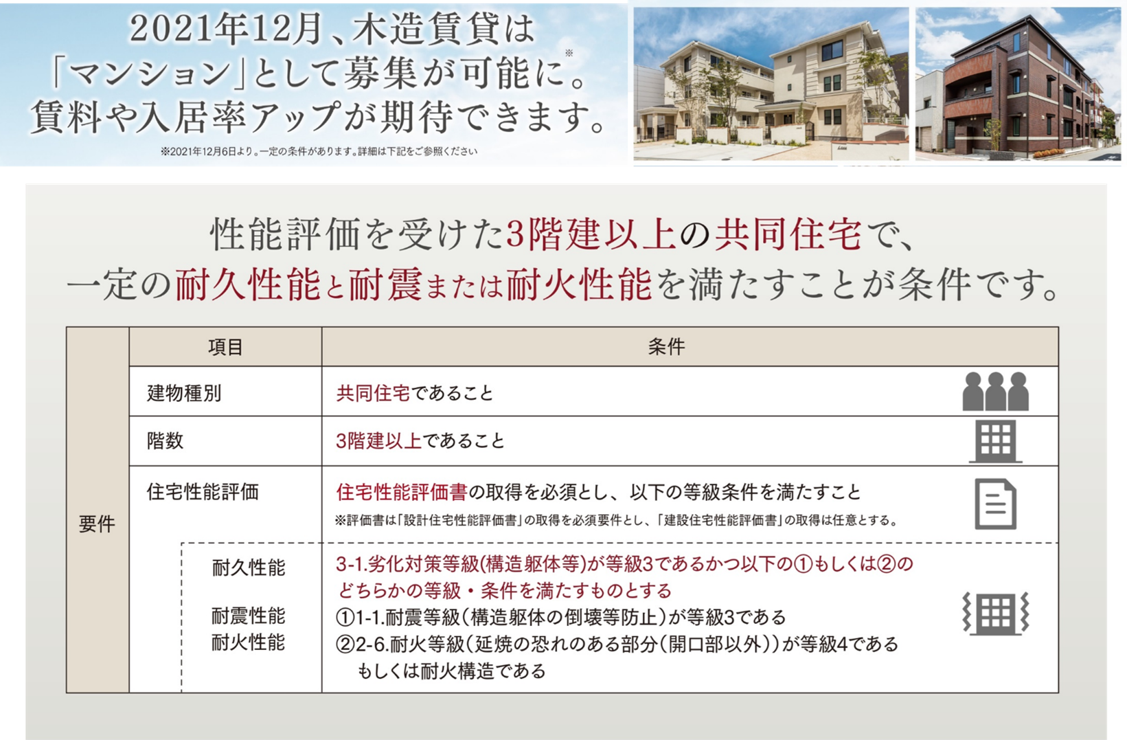 今回、当社の豊富な木造建築の実績によって培った技術力で、防火地域のエリア内にある本施設を木造の耐火建築物とすることができました。また一般的には、マンションは鉄骨造や鉄筋コンクリート造が主流ですが、本施設は以下の要件を満たす(※1)ことによって、「木造マンション」として大手賃貸募集ポータルサイトでの募集が可能です。