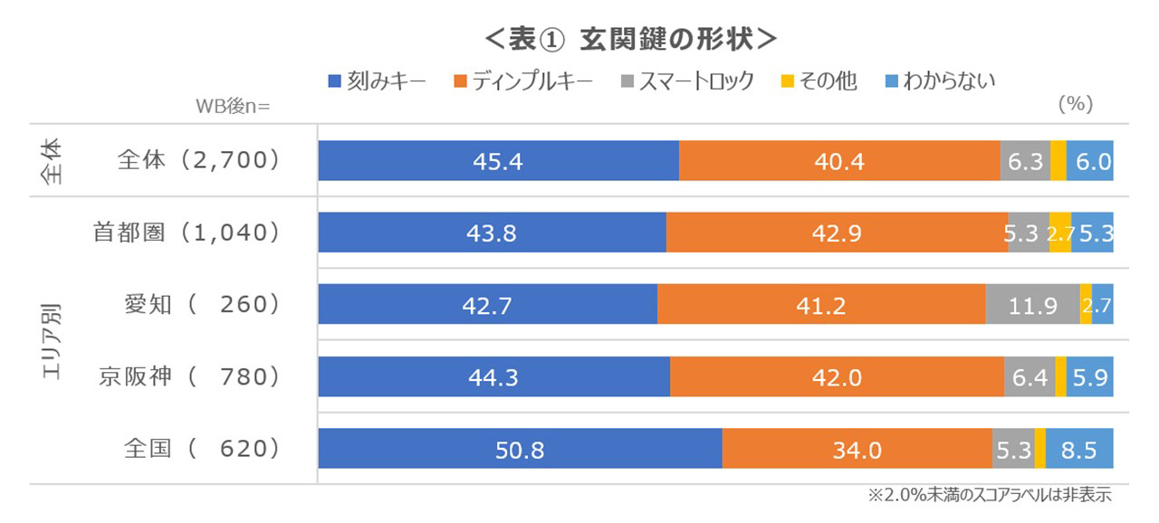 ・鍵の形状では、全体の45.4%が「刻みキー」、40.4%が「ディンプルキー」を使用。
