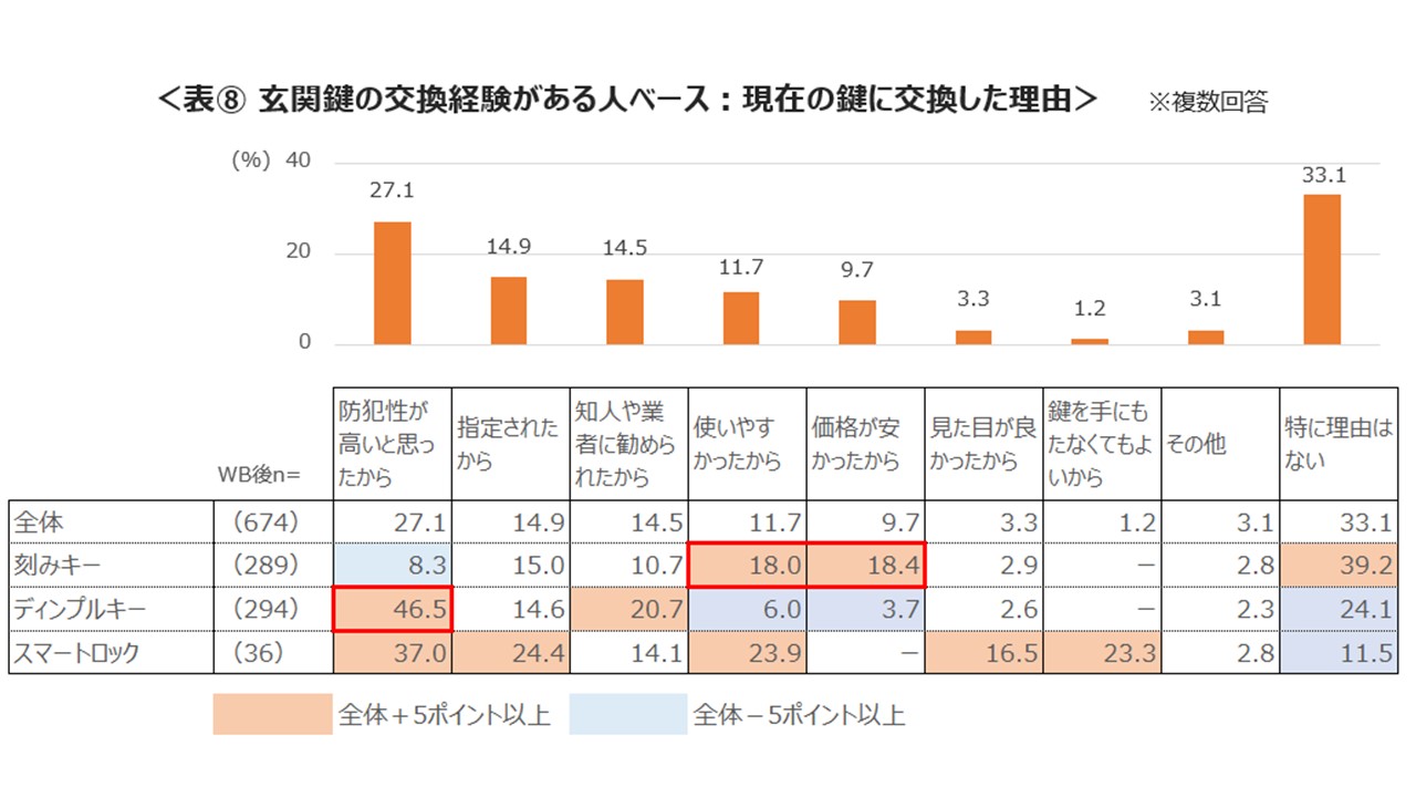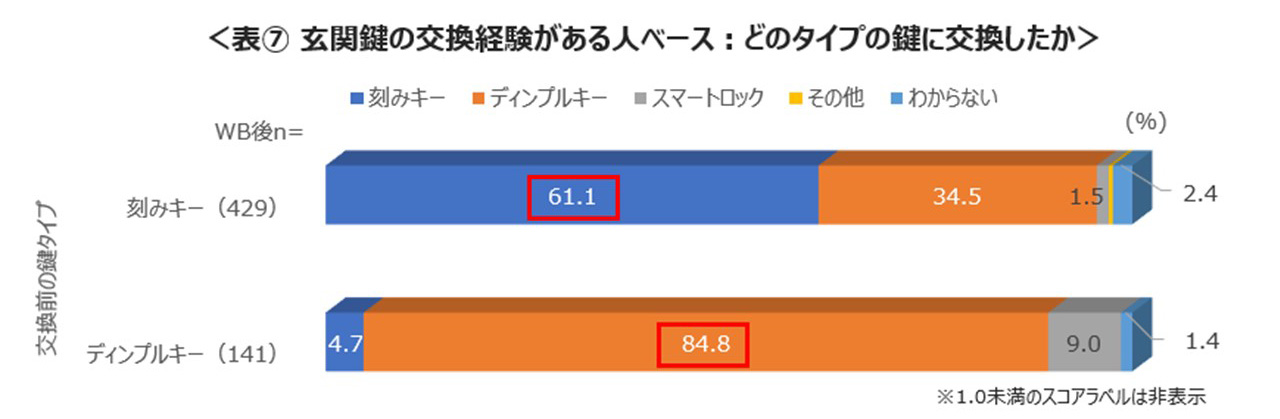 鍵の交換時、刻みキーの使用者の61.1%が刻みキーに、ディンプルキー使用者は84.8%がディンプルキーに交換しており、交換時も同じタイプを選ぶ傾向が見られた。ディンプルキーに交換した選択理由として「防犯性が高いと思ったから」を挙げた一方、刻みキーに変えた人は「使いやすかったから」「価格が安かったから」を選択し明確な差が見られた。