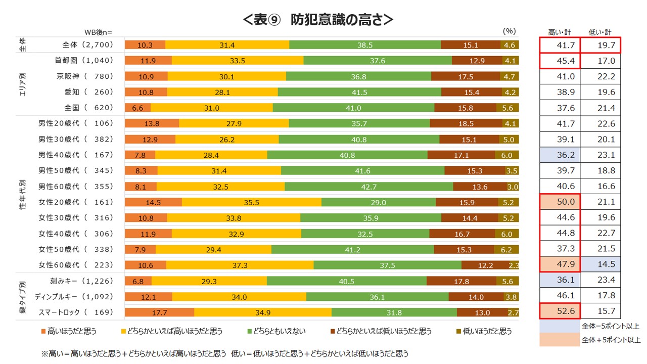 防犯意識の高さを尋ねたところ、約40%が「高い(高いほうだと思う+どちらかと言えば高いほうだと思う)」、約20%が「低い(低いほうだと思う+どちらかといえば低いほうだと思う)」と回答。全体と比較すると首都圏で「高い」と回答した人が多い傾向だった。総じて男性より女性のほうが防犯意識は高く、特に20歳代と60歳代にその傾向が強く見られた。さらにスマートロック利用者で防犯意識が高いと回答した人が多いという結果になった。