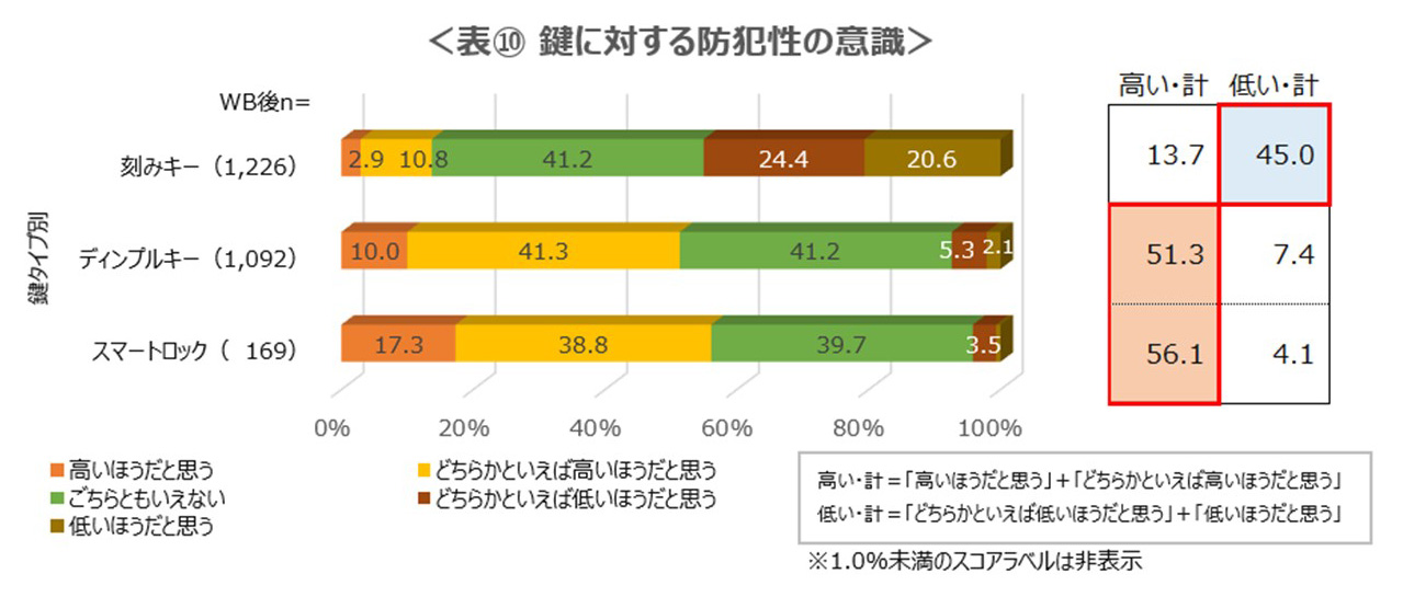 現在使用している鍵について防犯性に対する意識を聞いたところ、刻みキーの使用者のうち45%が防犯性は「低い」と認識していた。一方、ディンプルキーやスマートロックの使用者は防犯性が「高い」という回答が50%以上でした。防犯性が「低い」と感じていながらも防犯性の高い鍵にしない理由は、「交換費用が高いから/高そうだから」「賃貸なので勝手に交換できないから」といった回答が多く、防犯性よりも費用や居住環境といった制約が優先されている実態が明らかになった。