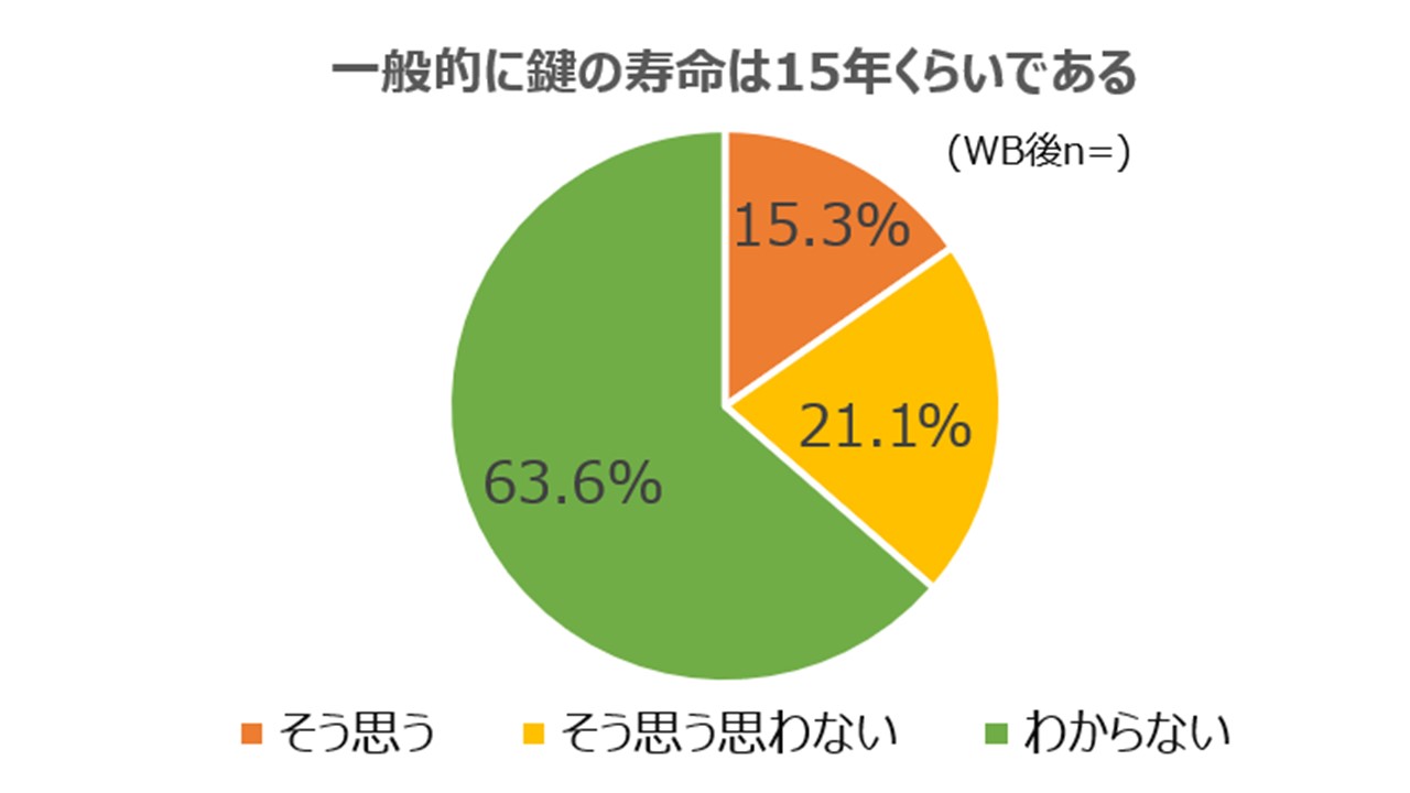 居住年数が長くなるほど、鍵の摩耗や不具合のリスクは高まります。15年以上、鍵を使い続けている(鍵の交換経験がない)人が全体で31.7%にのぼります(表④)。さらに鍵の耐用年数に関する質問をしたところ63%以上が「わからない」と回答。鍵のメンテナンスに関する認識が十分ではない可能性があることも確認されました。こうした状況のまま適切なタイミングで鍵の交換や点検を行わない場合、突然の故障につながるおそれがあると考えられます。