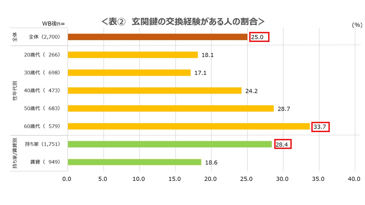 ・鍵の交換経験がある人は全体の25%。持ち家や高年齢層で鍵の交換経験率が高い。
