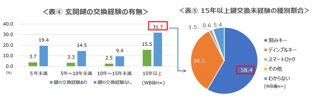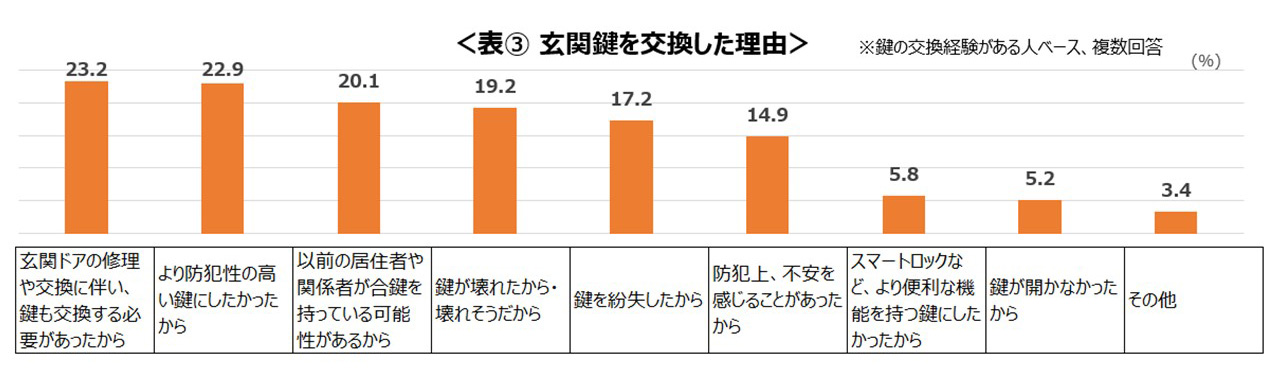 入居時以降に玄関鍵の交換経験がある人は全体の25%で、持ち家や高年齢層で交換経験率が高い。交換理由は「玄関ドアの修理や交換に伴い、鍵を交換する必要があったから」や「より防犯性の高い鍵にしたかったから」など多岐にわたって挙げられた。居住後、15年以上鍵を交換したことがない割合は31.7%であり、そのうち刻みキーを利用している使用者は58.4%であった。