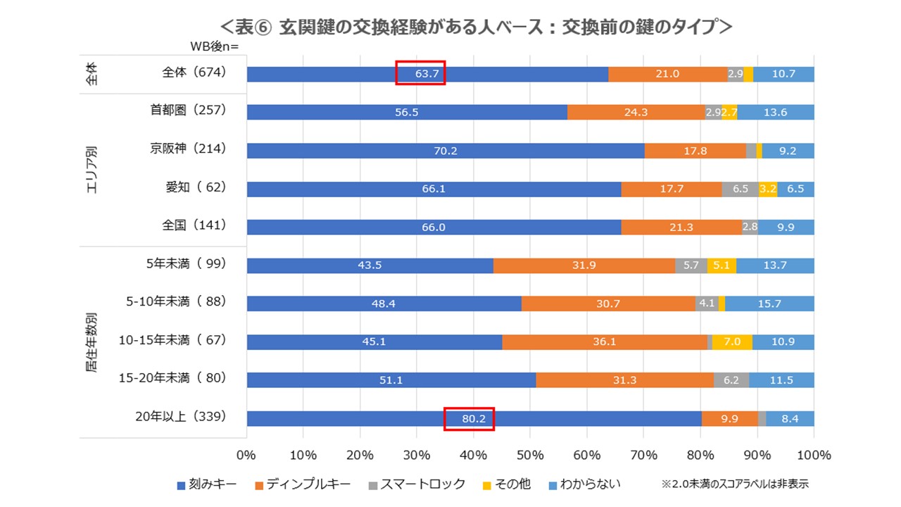 鍵の交換経験がある人の交換前の鍵タイプは刻みキーが最多であり、全体の63.7%。居住年数が長いほど刻みキーの使用者が多く、居住20年以上だと80%以上が刻みキーを使用しているという結果となった。