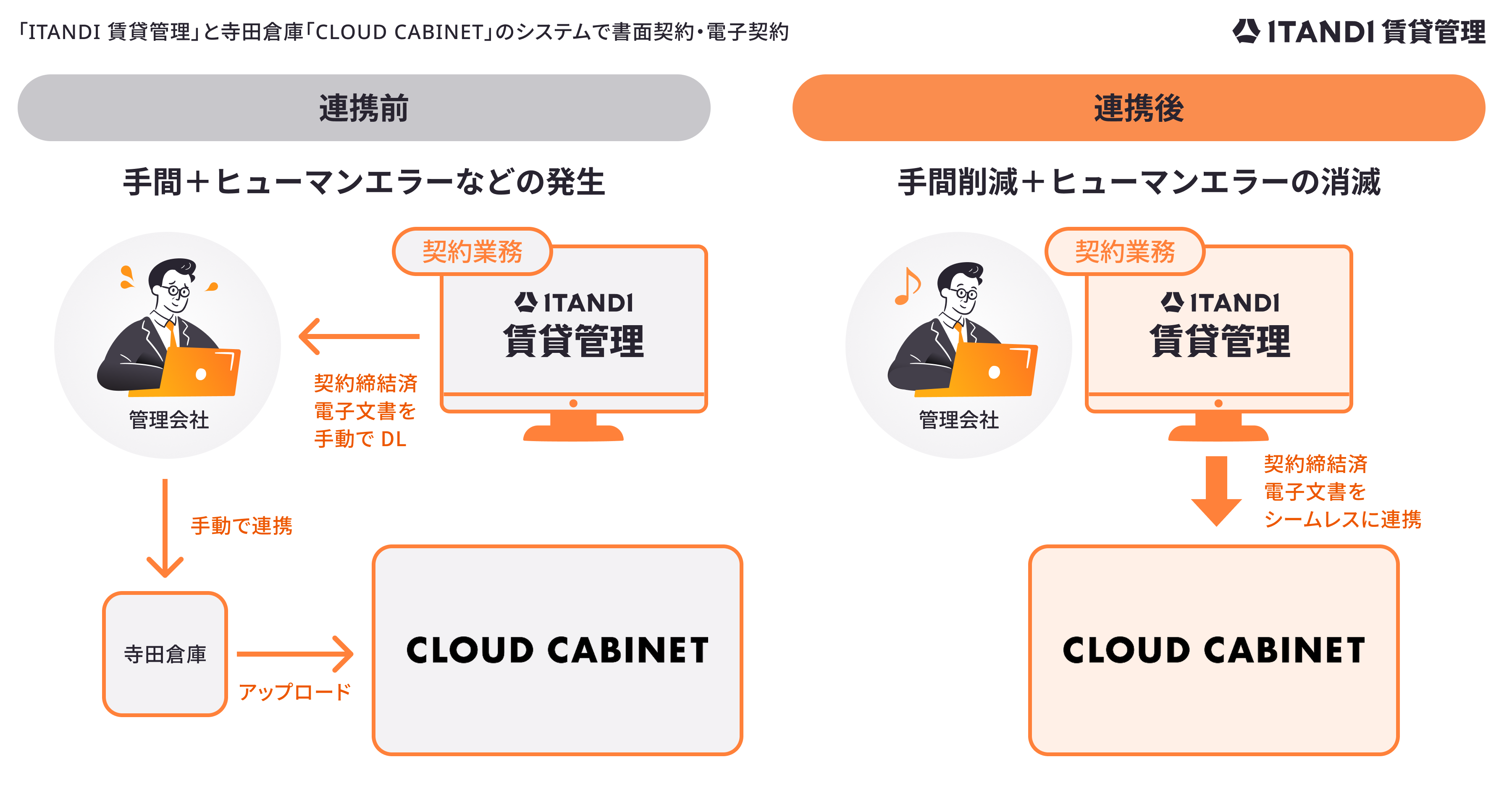 しかし、従来の運用では「ITANDI 賃貸管理」で電子契約が完了した書類をダウンロードし、寺田倉庫へ手動で連携した上で、「CLOUD CABINET」へのアップロードを依頼する必要があり、業務負荷が課題になっていました。