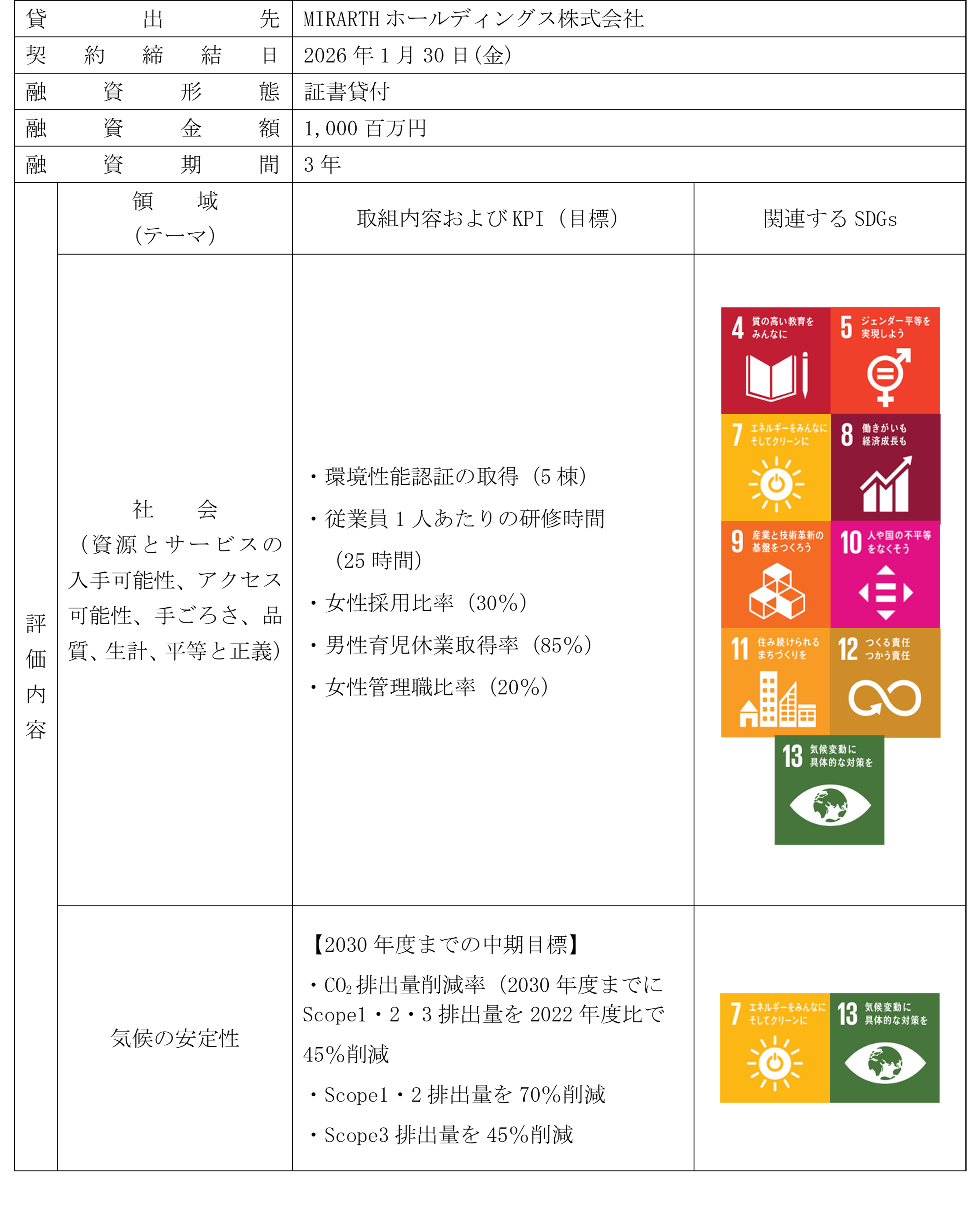 MIRARTHホールディングス株式会社(本社:東京都千代田区/代表取締役:島田和一)は、株式会社千葉銀行(本店:千葉県千葉市/頭取:米本努)が提供する「ポジティブ・インパクト・ファイナンス(資金使途を限定しない事業会社向け投融資タイプ)」による融資契約を締結し、資金調達を実施しましたので、お知らせいたします。