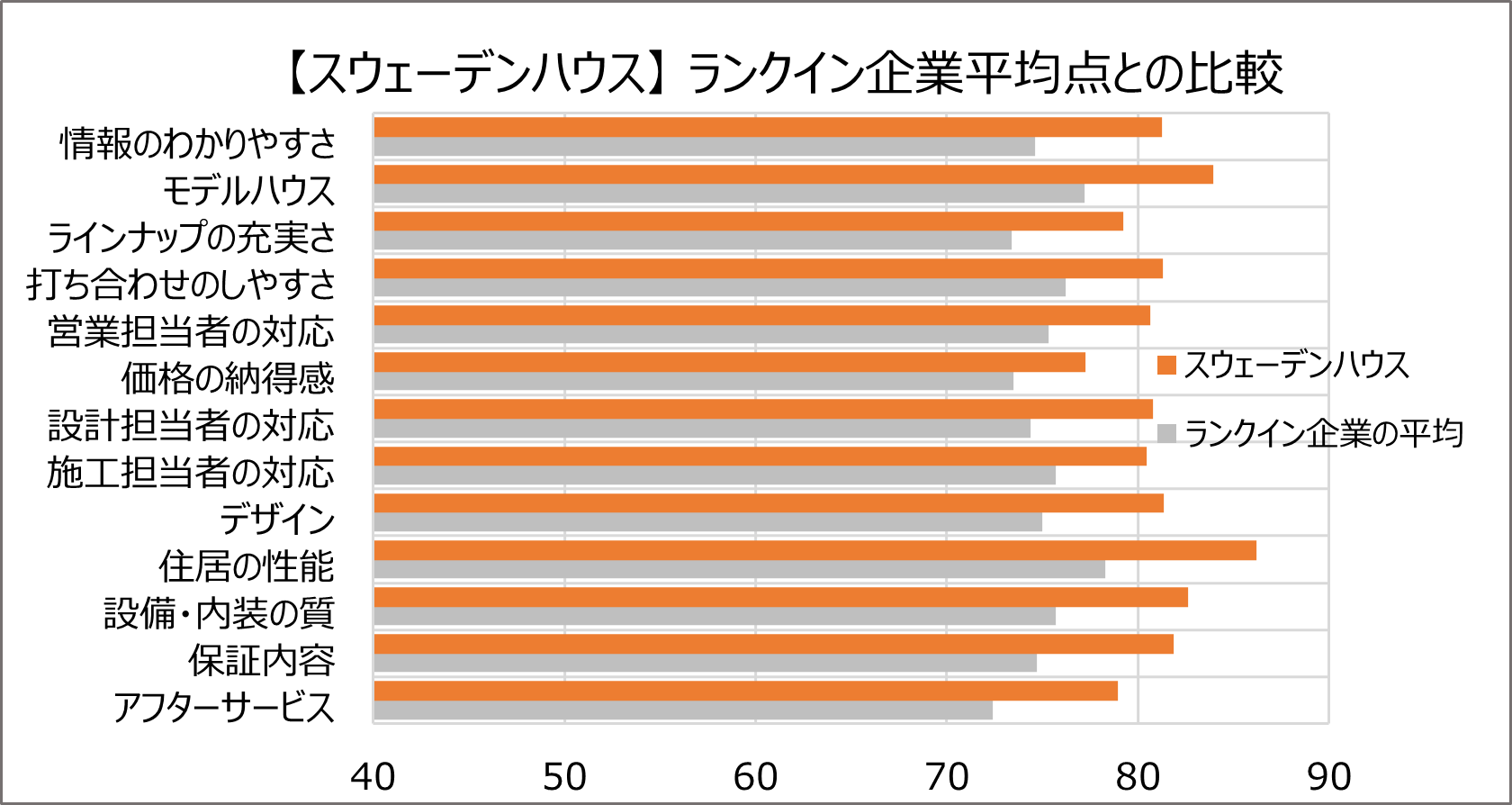 また、【スウェーデンハウス】は、“断熱性や気密性の高さ”などを評価した「住居の性能」は86.2点と当ランキングでもっとも高い得点に。そのほか、“ホームページや住宅カタログのわかりやすさ”などを評価した「情報のわかりやすさ」(前年差+0.6pt)と、“商品ラインナップの豊富さ“などを評価した「ラインナップの充実さ」(前年差+0.5pt)の2項目では、いずれも昨年からとくに満足度得点が上昇しました。なかでも「情報のわかりやすさ」は2位との差が3.3ptと、とくに大きな得点差がみられました。
