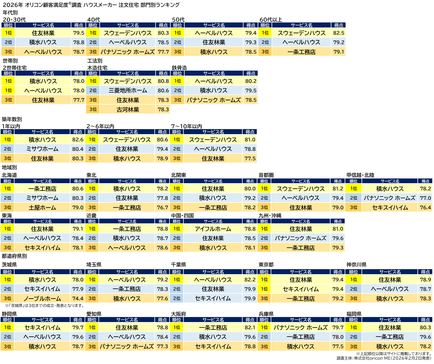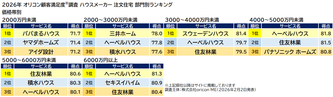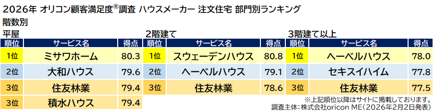 オリコン株式会社(本社:東京都港区 代表取締役社長:小池 恒、略称:オリコン)は、グループ会社である株式会社oricon MEが、実際のサービス利用者を対象に第三者の立場で実施した『ハウスメーカー 注文住宅』の顧客満足度調査の結果を、2026年2月2日(月)14時に「オリコン顧客満足度®」公式サイト内にて発表いたしました。ランキングの結果は、下記の通りとなりました。