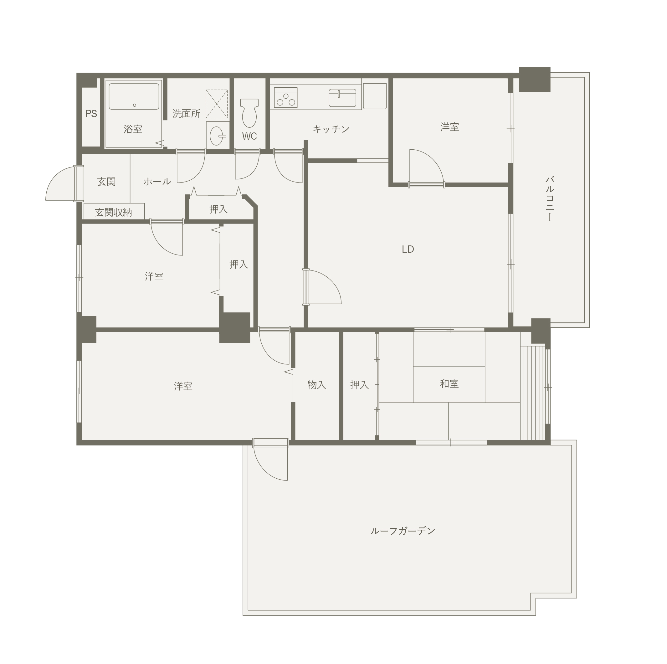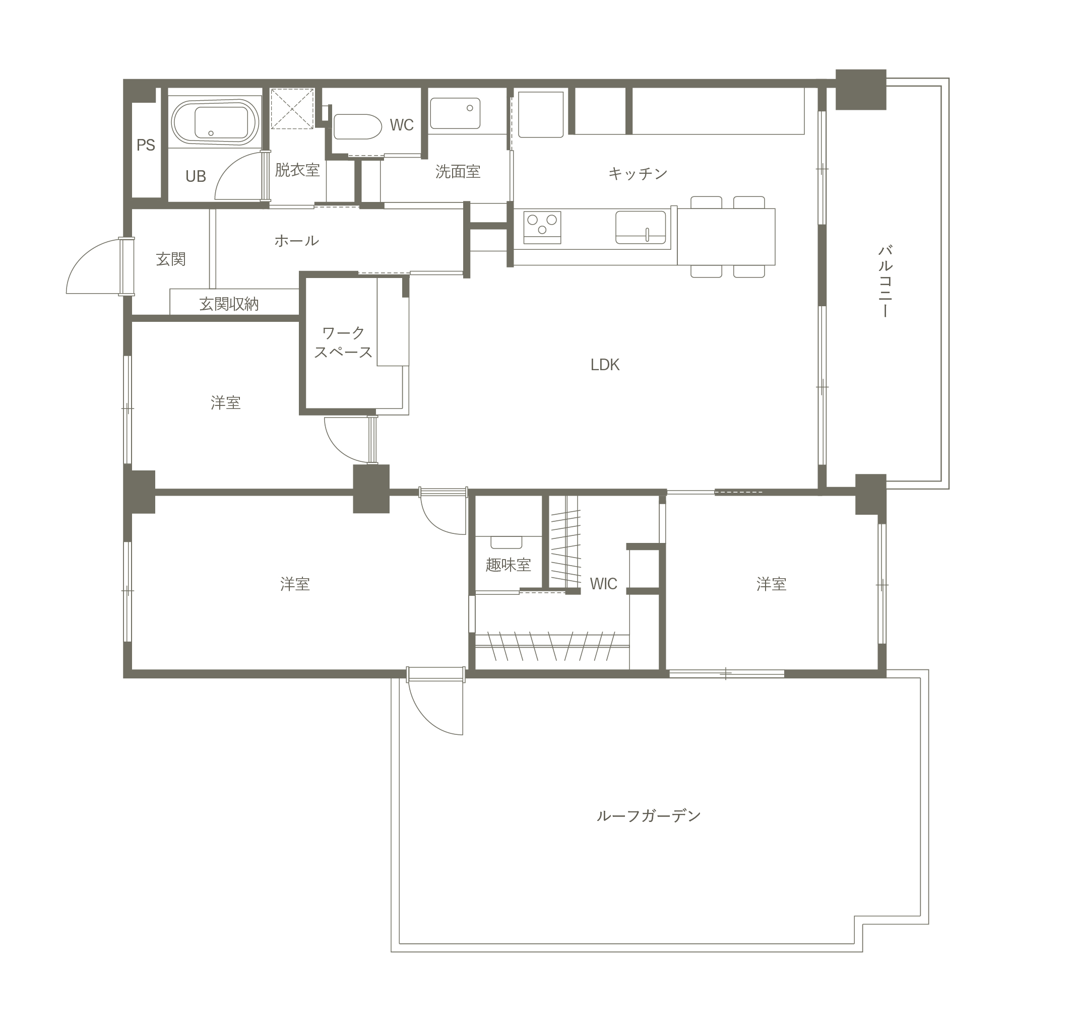 お風呂と脱衣室の隣にトイレと洗面を配置し、その先にキッチンをつなげた間取り。洗面を脱衣室の外に出すことで、いつでも使いやすく、帰宅動線と生活動線が重ならないよう工夫しています。