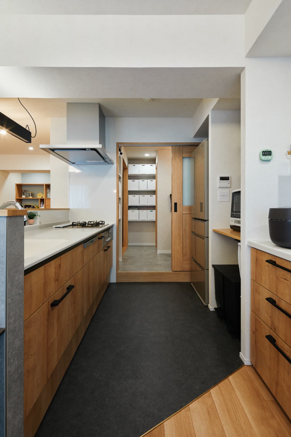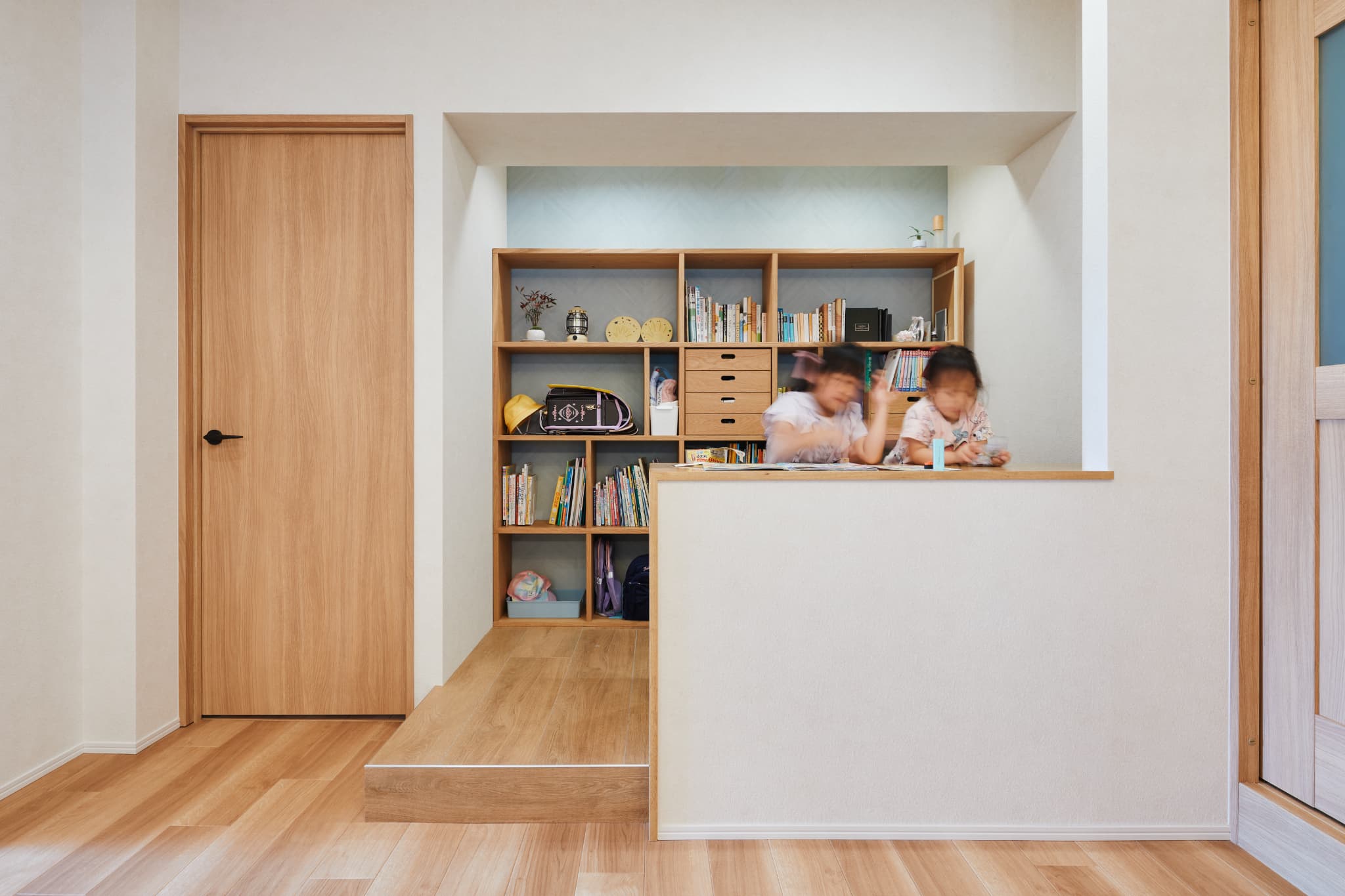段差を設けた小上がりをワークスペースとして計画。座っている人とリビング側にいる人の目線が近くなるよう設計し、机を挟んで対面で会話ができる配置にしています。勉強や作業をしながらも、家族の気配を感じられる“リビング基準の暮らし”がこの住まいの特徴です。