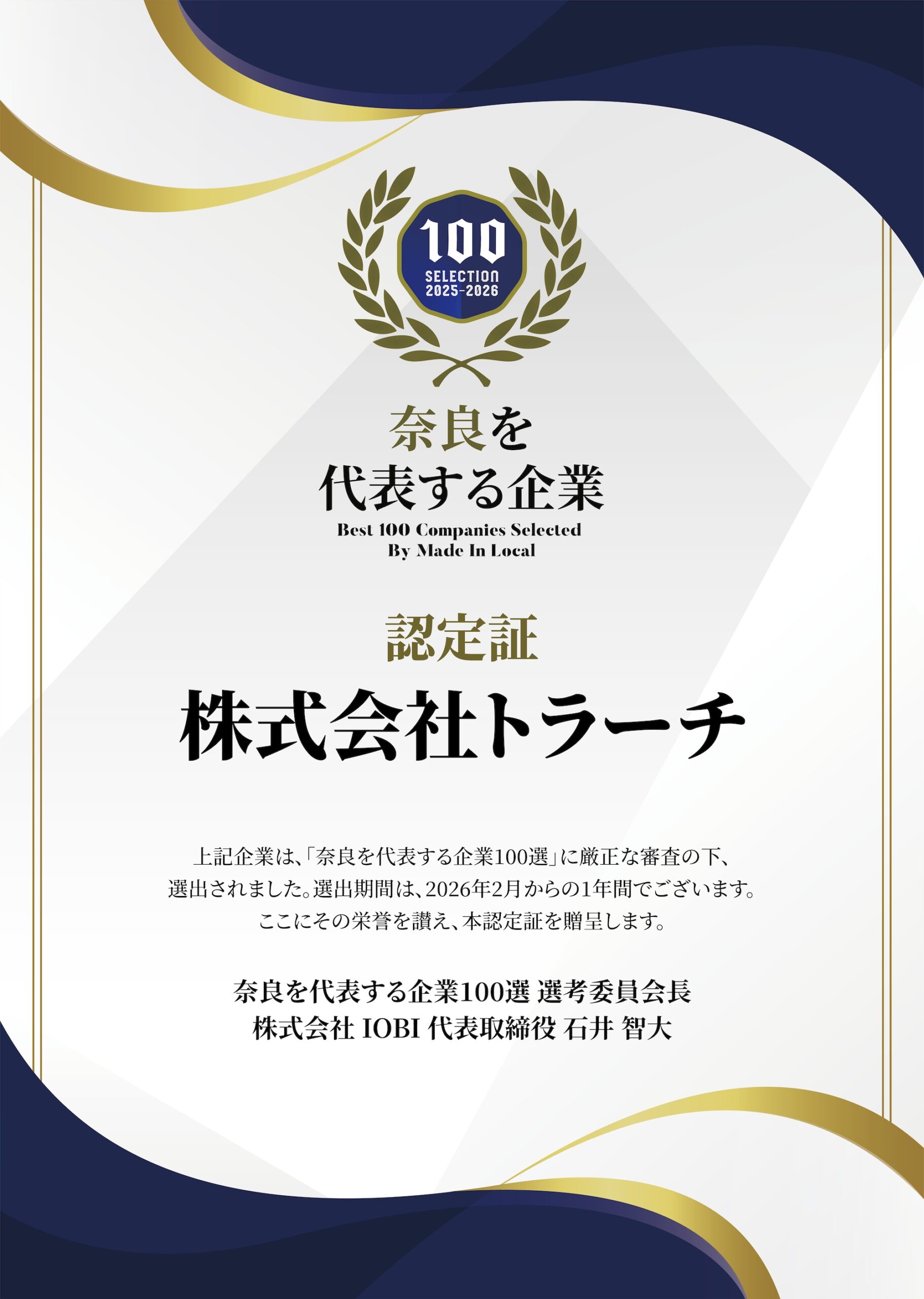 株式会社トラーチは、2026年1月6日、地方創生メディア「Made In Local」が選出する「奈良を代表する企業100選」に選出されました。本取り組みは、地域社会への貢献や若手育成、独自性のある事業モデルなどを基準に、奈良県内の企業を厳選して紹介するものです。トラーチは、「住まいと家計を守る」という理念のもと、太陽光発電・蓄電池事業を中心に、地域に根ざした誠実な事業運営を続けてきました。また、若手人材の育成や再現性のある営業体制づくりにも力を入れ、未経験からでも成長できる環境を整えています。こうした姿勢が、地域や第三者から評価されたことは、トラーチが学生本人だけでなく、その家族にとっても安心して選べる企業であることの一つの証だと考えています。