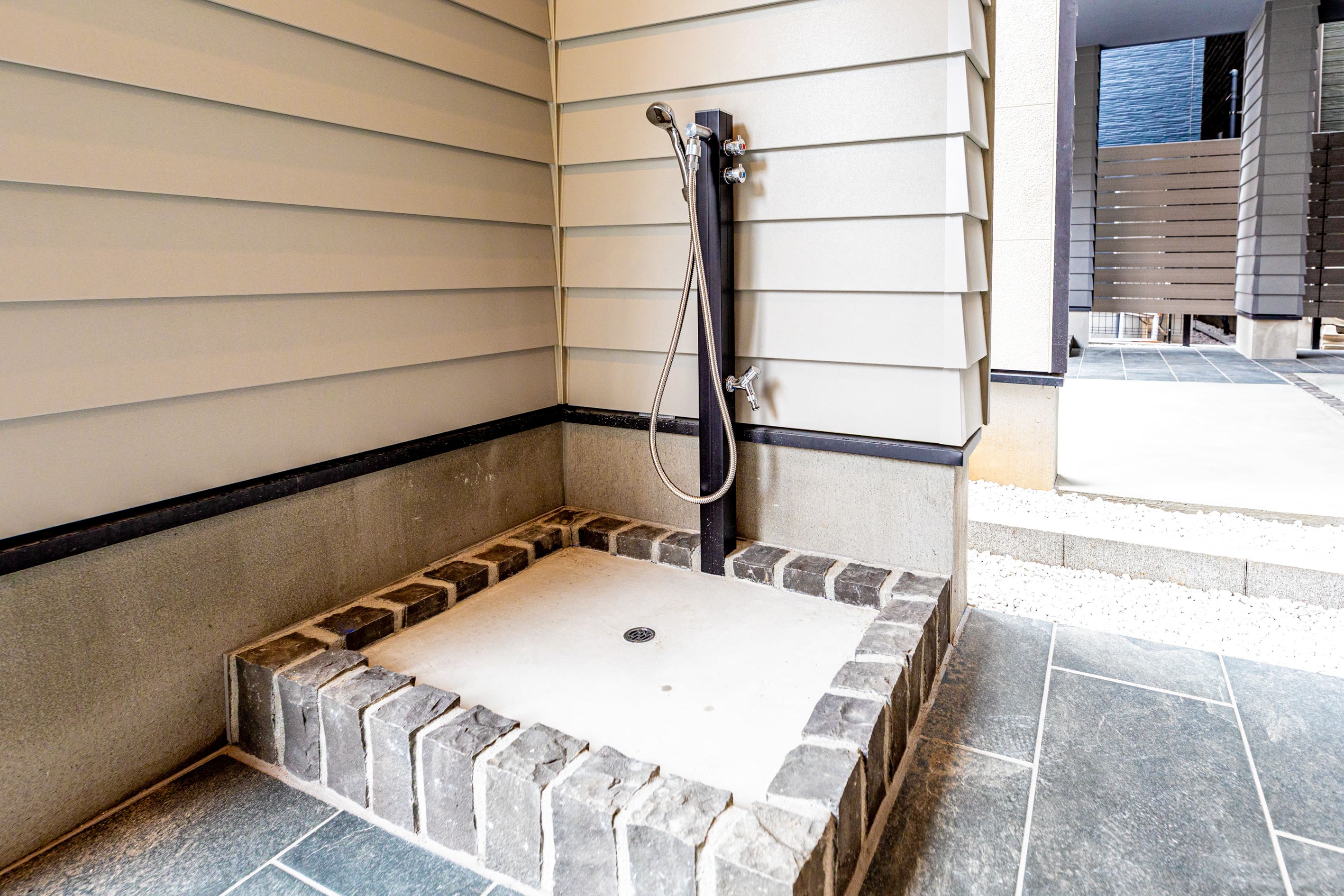 玄関外には散歩帰りにすぐ足を洗える「わんこシャワー」を設置し、玄関ドア脇にはリードフックを備えることで、外出前後の動作がスムーズになるように配慮しました。玄関にはワンちゃん用品をまとめて収納できるシューズインクローゼットを設け、内部には有効ボードを設置することで、必要なアイテムをすぐに取り出せる収納計画としています。