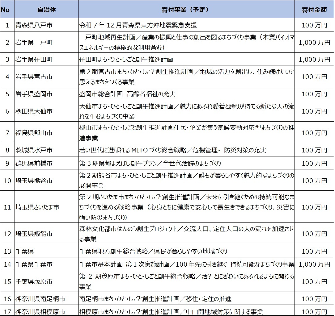 • 企業版ふるさと納税で新たに3自治体への寄付を実施(2025年03月31日)