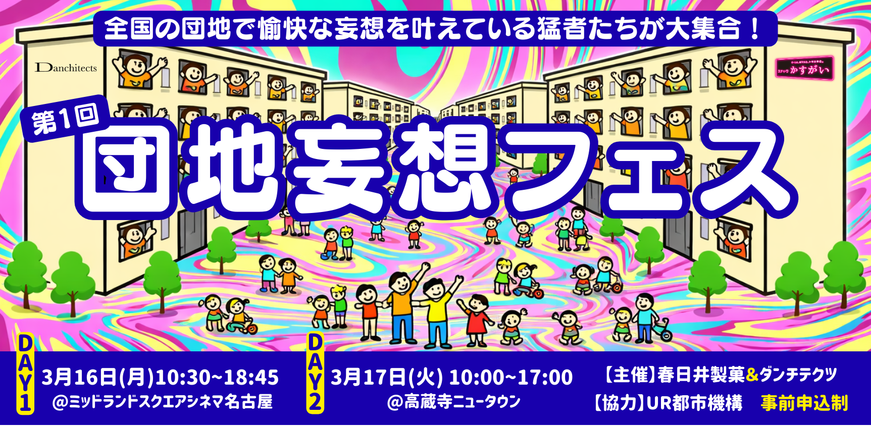 春日井製菓株式会社(本社:愛知県名古屋市、代表取締役:春日井大介、以下「当社」)の仲間づくりの専門部署「おかしな実験室」と、建築家・工務店による団地デザインユニット「ダンチテクツ」(本拠地:愛知県春日井市高蔵寺ニュータウン、井村正和・河合忠・酒井悠行・内藤太一・ナゴノダナバンク)は、団地を舞台にさまざまな社会課題を楽しく解決しようと奮闘している実践者たちを全国から招き、その情熱とノウハウをかき混ぜる2日間のイベント「団地妄想フェス」を、3月16日(月)と17日(火)に愛知で開催します。本イベントは、団地という社会の縮図から未来の地域づくりを考える試みです。