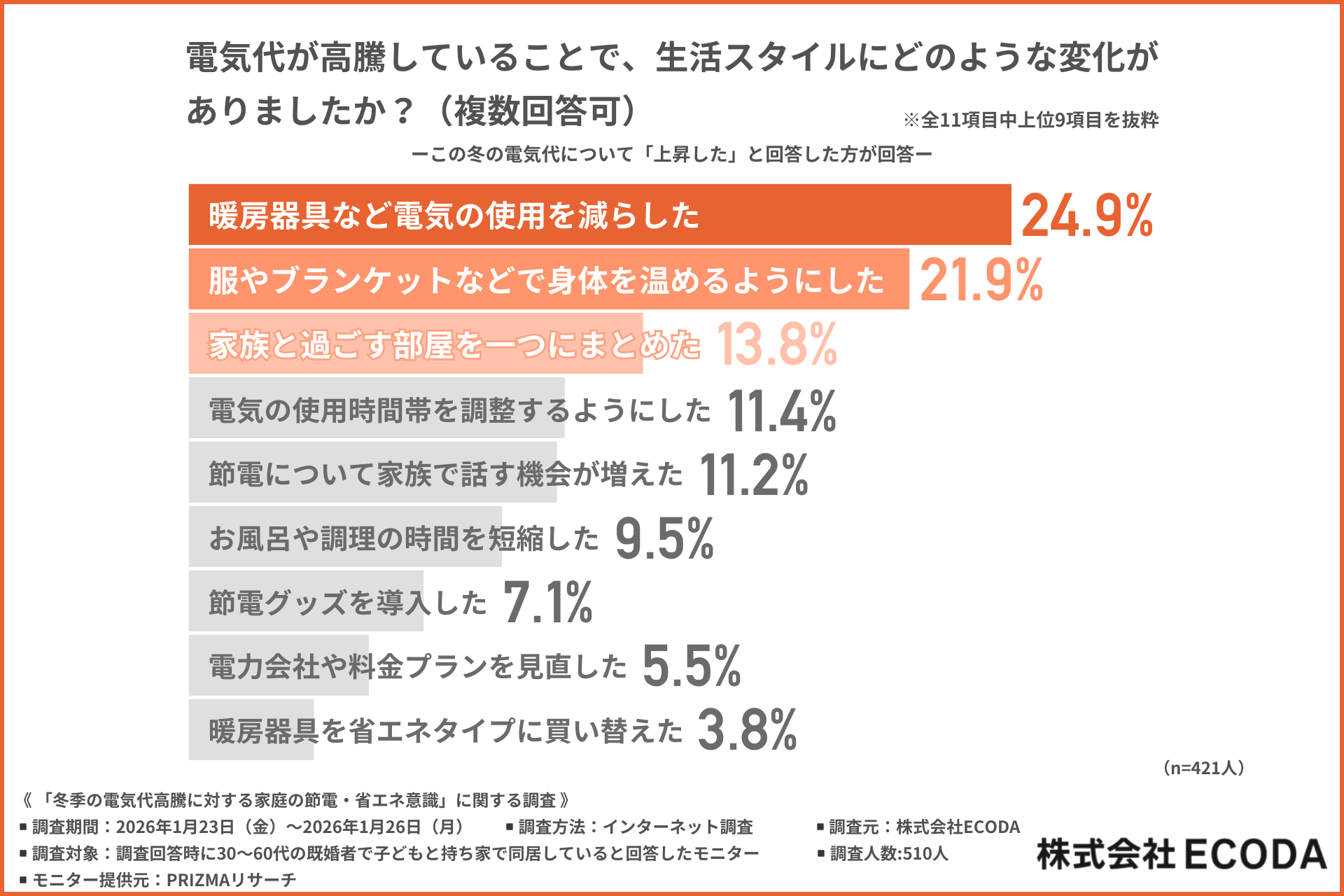 株式会社ECODA(本社:東京都渋谷区、代表取締役:平間 一也、https://ecoda-corp.com/)は、30〜60代の既婚者で子どもと持ち家で同居している方を対象に、「冬季の電気代高騰に対する家庭の節電・省エネ意識」に関する調査を行いました。