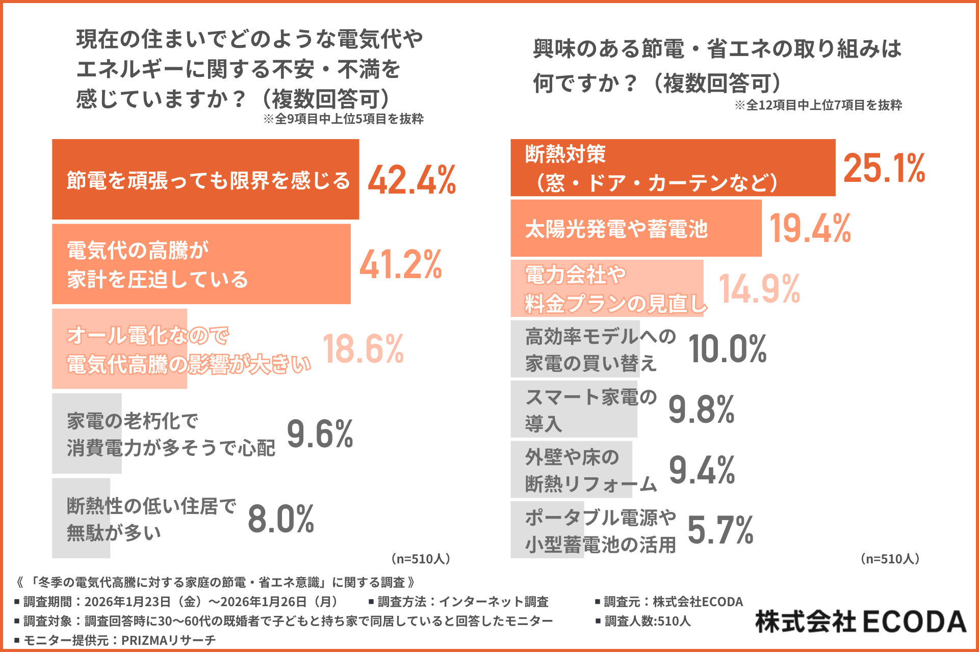 そこで今回、太陽光発電と蓄電池施工を専門に手がける株式会社ECODA(エコダ)は、30〜60代の既婚者で子どもと持ち家で同居している方を対象に、「冬季の電気代高騰に対する家庭の節電・省エネ意識」に関する調査を行いました。