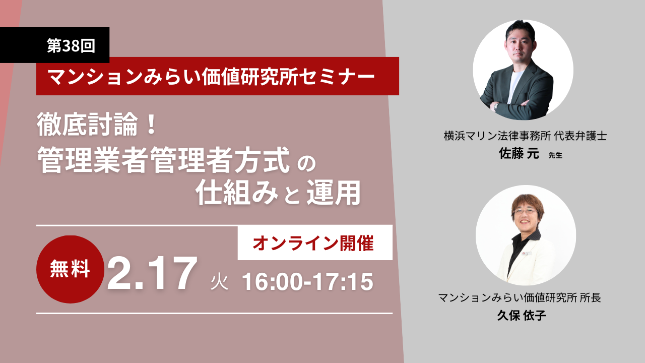 大和ハウスグループの大和ライフネクスト株式会社(本社:東京都港区、代表取締役社長:齋藤 栄司) の分譲マンション総合研究所「マンションみらい価値研究所」は、マンションのみらいを考える無料WEBセミナー『徹底討論!管理業者管理者方式の仕組みと運用』を、2026年2月17日(火)に配信いたします。