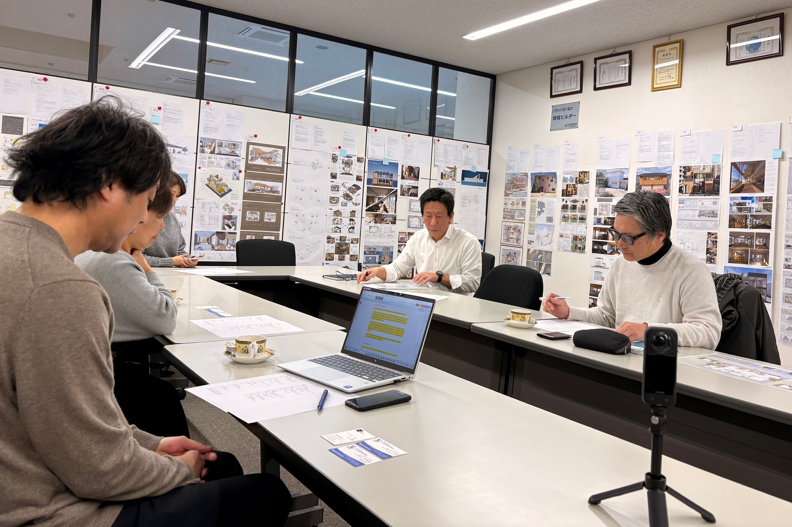 審査員は社内4名(設計・工務・営業・役員)と外部建築士3名の計7名で構成。2次審査では点数方式を採用し、公平な評価を行いました。