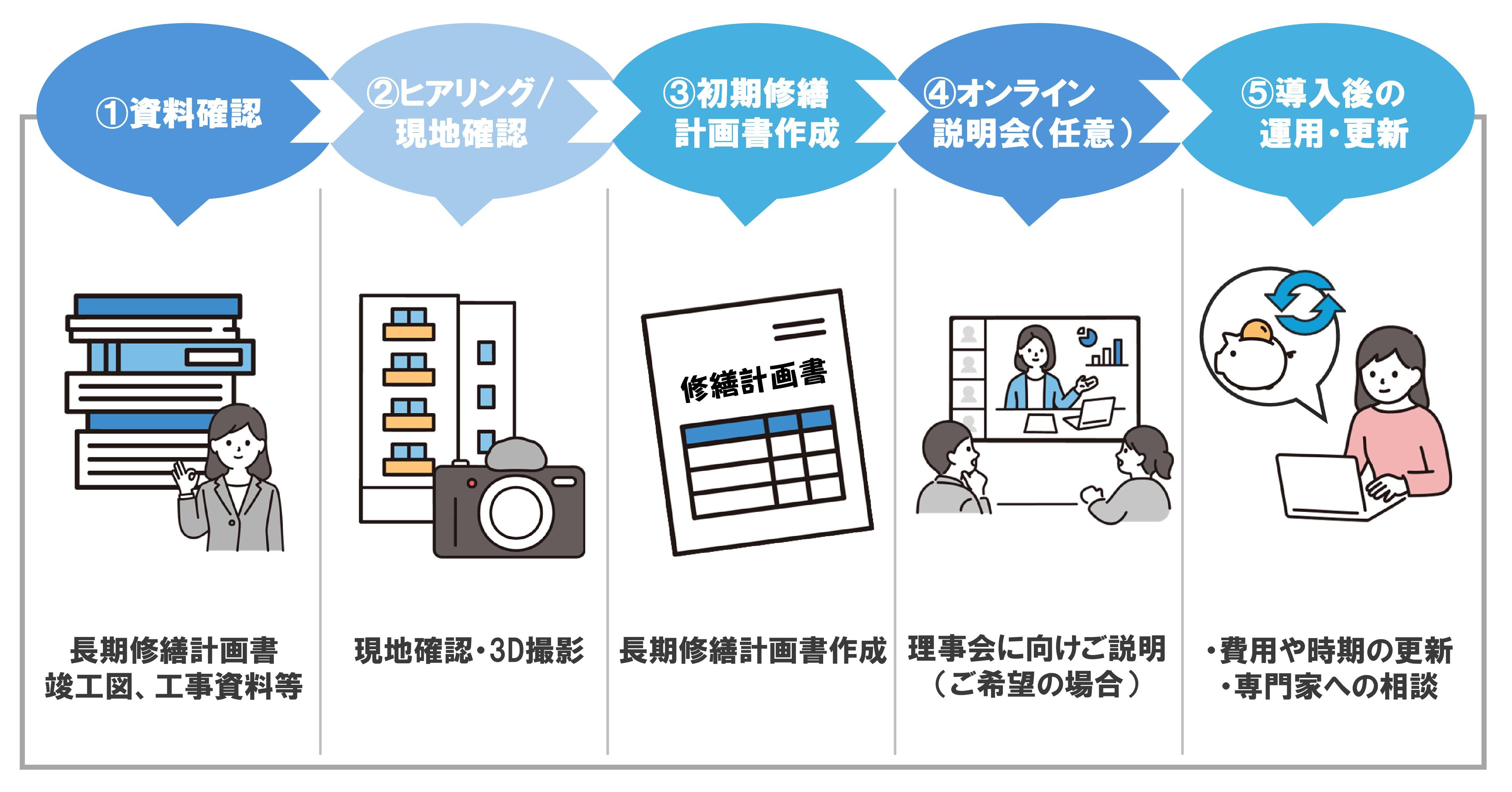 ※建物情報の整理、ベース長期修繕計画の作成、理事会向け説明資料の作成、初期設定等含む