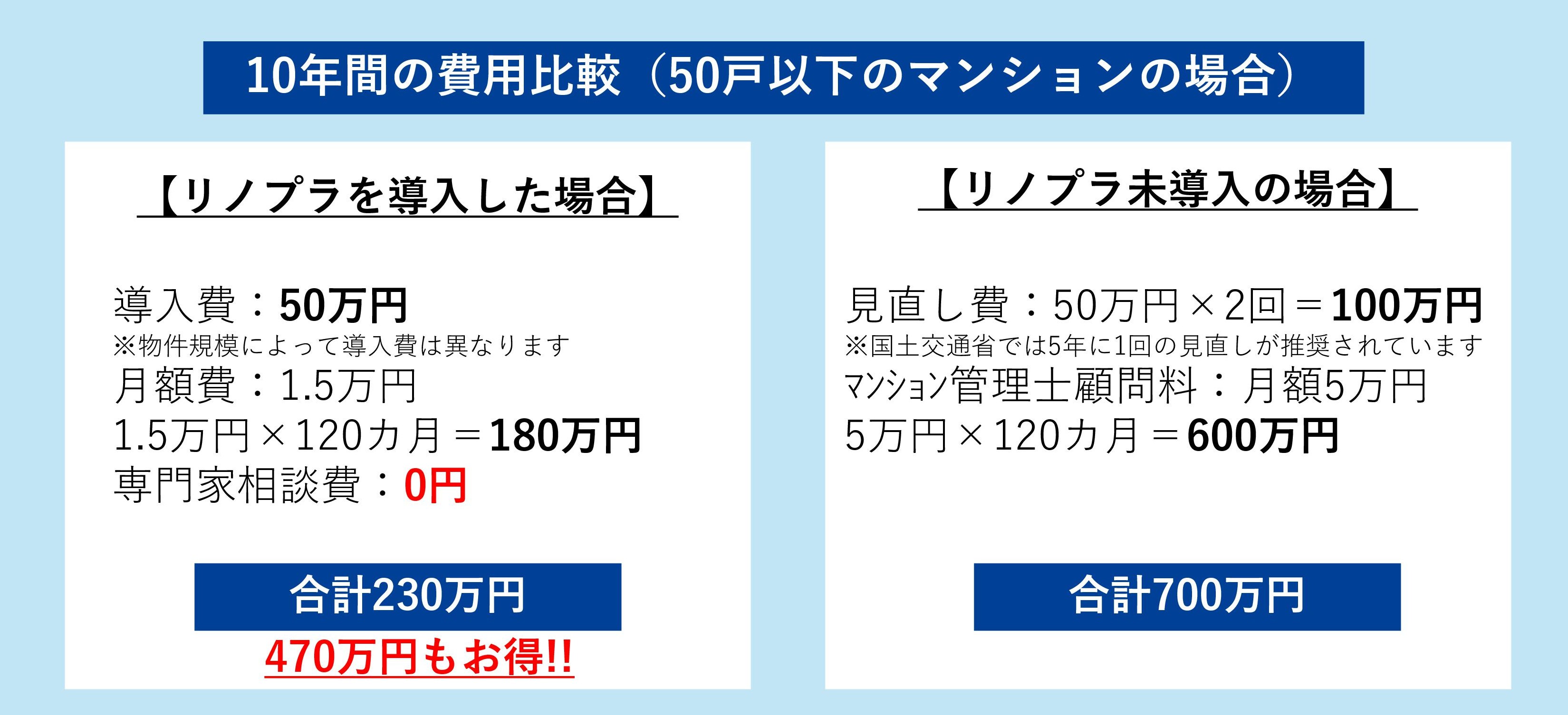 一方「リノプラ」では、月額15,000円×120カ月=約230万円となり、10年間で約470万円のコスト削減が可能です。