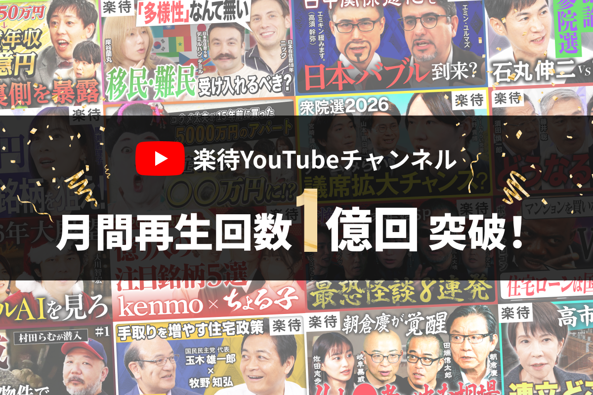 楽待株式会社(本社:東京都中央区、東証スタンダード、証券コード:6037)が運営するYouTubeチャンネル「楽待 RAKUMACHI」の2026年1月の月間再生回数が1億回を突破しました。月間再生回数が1億回を超えるのは、2009年のチャンネル開設以来初となります。2026年1月は、ショート動画を含む184本の動画を公開し、1億317万回再生を記録しました。国際情勢や政治に関する解説・速報動画を中心に再生回数が大きく伸びています。