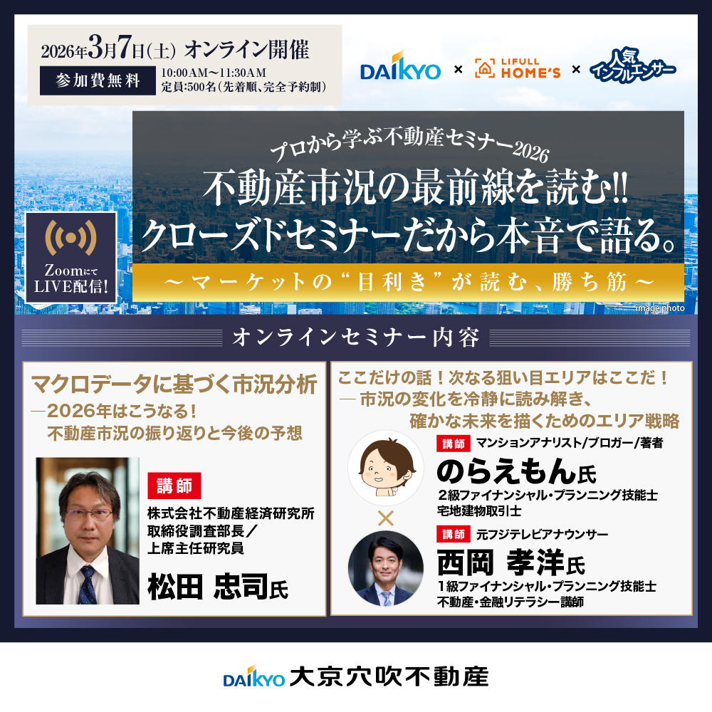 株式会社大京穴吹不動産(本社:東京都渋谷区)は、2026年3月7日(土)にオンラインにて『プロから学ぶ不動産セミナー 2026 不動産市況の最前線を読む‼クローズドセミナーだから本音で語る。~マーケットの“目利き”が読む、勝ち筋~』を株式会社LIFULLと共同開催いたします。ゲストに株式会社不動産経済研究所の松田忠司氏、マンションアナリストののらえもん氏と元フジテレビアナウンサーの西岡孝洋氏を迎え、「マクロデータに基づく市況分析」や「ここだけの話!次なる狙い目エリアはここだ!」をテーマに語っていただきます。オンライン開催で参加費無料、事前予約制です。
