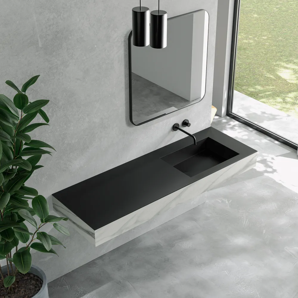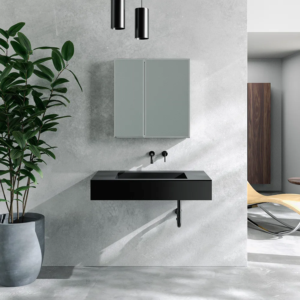 1. 重力を感じさせない「浮遊する洗面台」壁面に浮かぶような佇まいを実現することで、空間に広がりと建築的な美しさをもたらします。