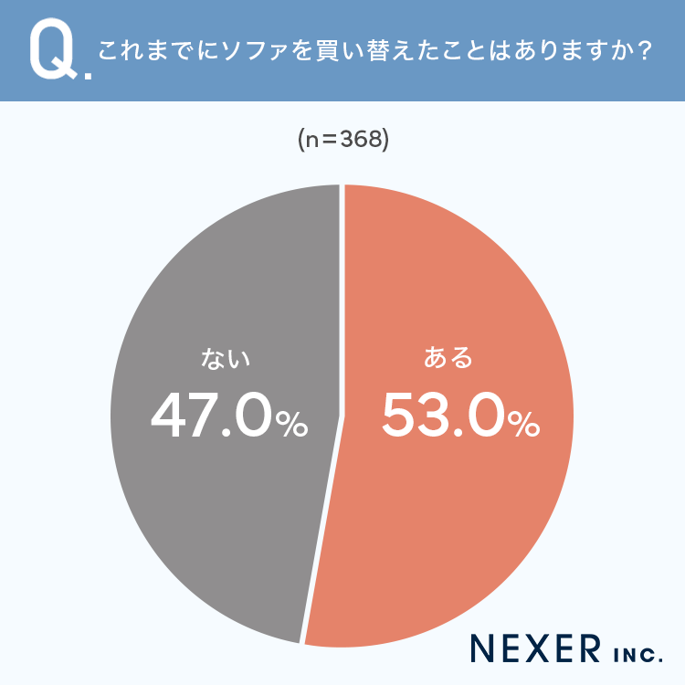 その結果「ある」が53.0%、「ない」が47.0%でした。半数以上の方がソファの買い替えを経験していることがわかります。
