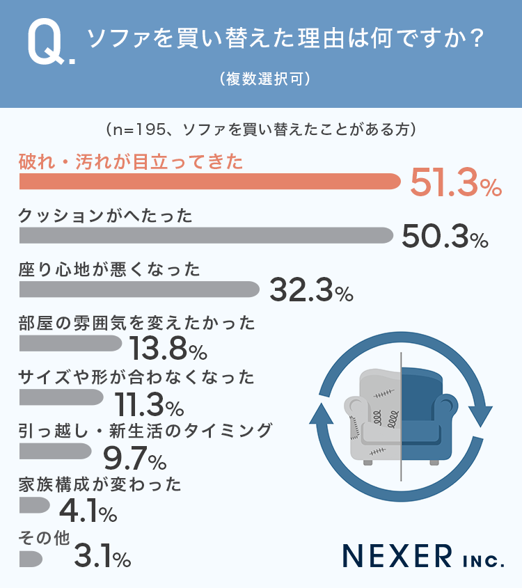 結果として、最も多かった理由は「破れ・汚れが目立ってきた」で51.3%でした。次いで「クッションがへたった」が50.3%、「座り心地が悪くなった」が32.3%という結果になりました。見た目の劣化と機能面の低下が、買い替えの大きなきっかけとなっているようです。