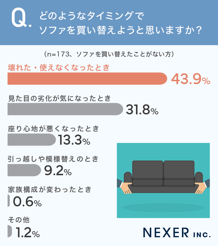 結果として、最も多かったのは「壊れた・使えなくなったとき」で43.9%、次いで「見た目の劣化が気になったとき」が31.8%、そして「座り心地が悪くなったとき」が13.3%という結果になりました。
