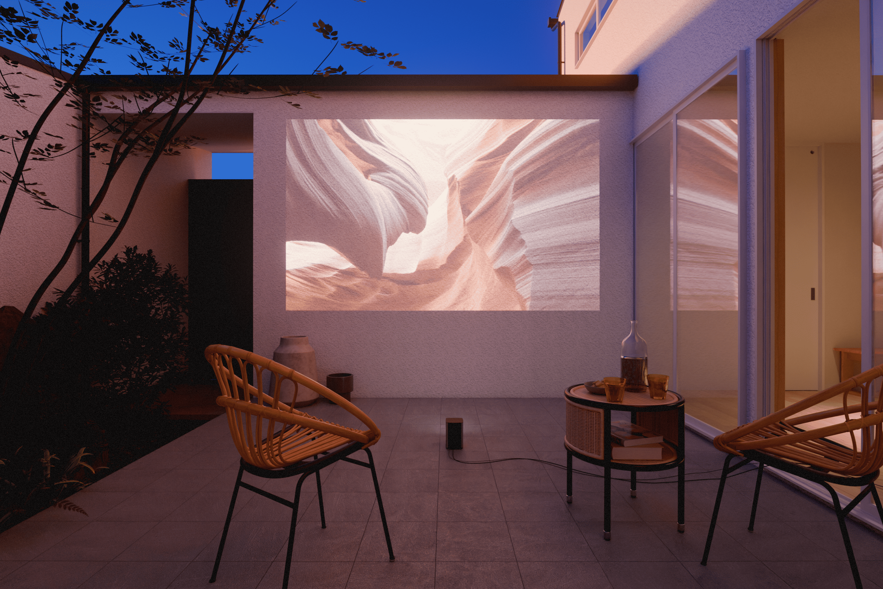 中庭北側の壁。フラットで真っ白な壁はプロジェクターの導入で、屋外ホームシアターにも。