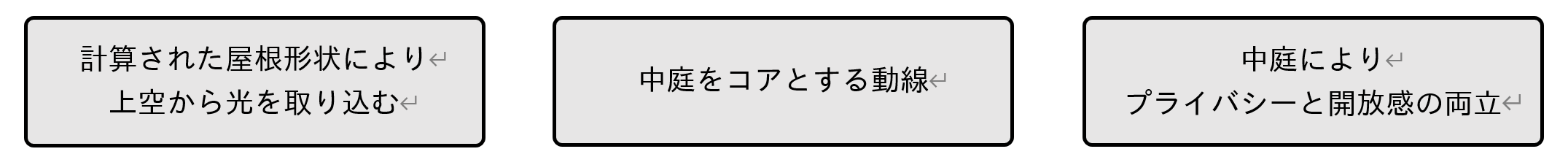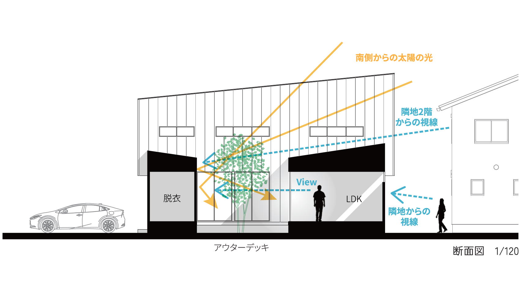 こうした条件の敷地において、「あえて南寄せスタイル」では、計算された屋根形状により上空から光を取り込み、中庭(アウターデッキ)を通じて室内に自然光を確保するプランをご提案します。