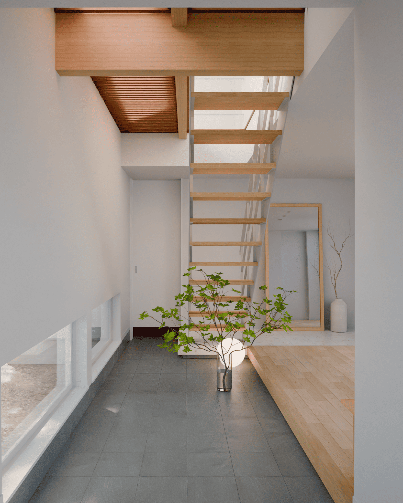 玄関には2階のスノコ床から、玄関ホールには中庭から柔らかな自然光が差し込む。玄関土間奥には大きなシューズクロークを配置。