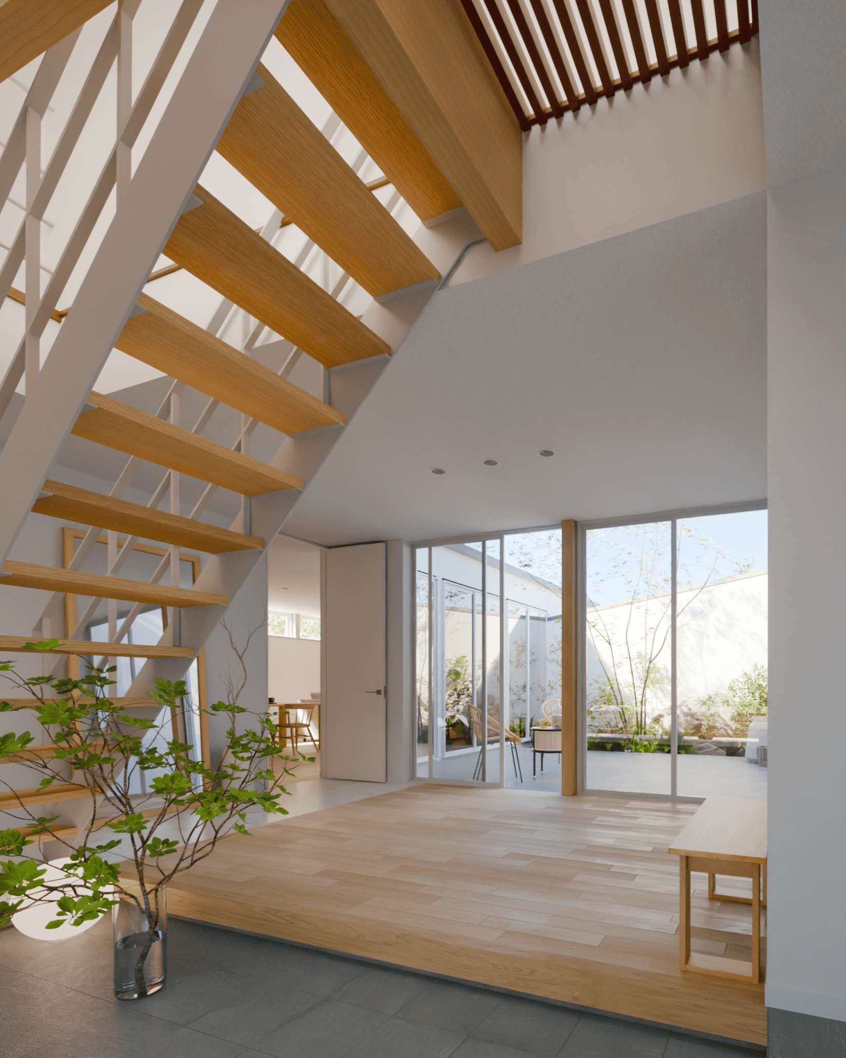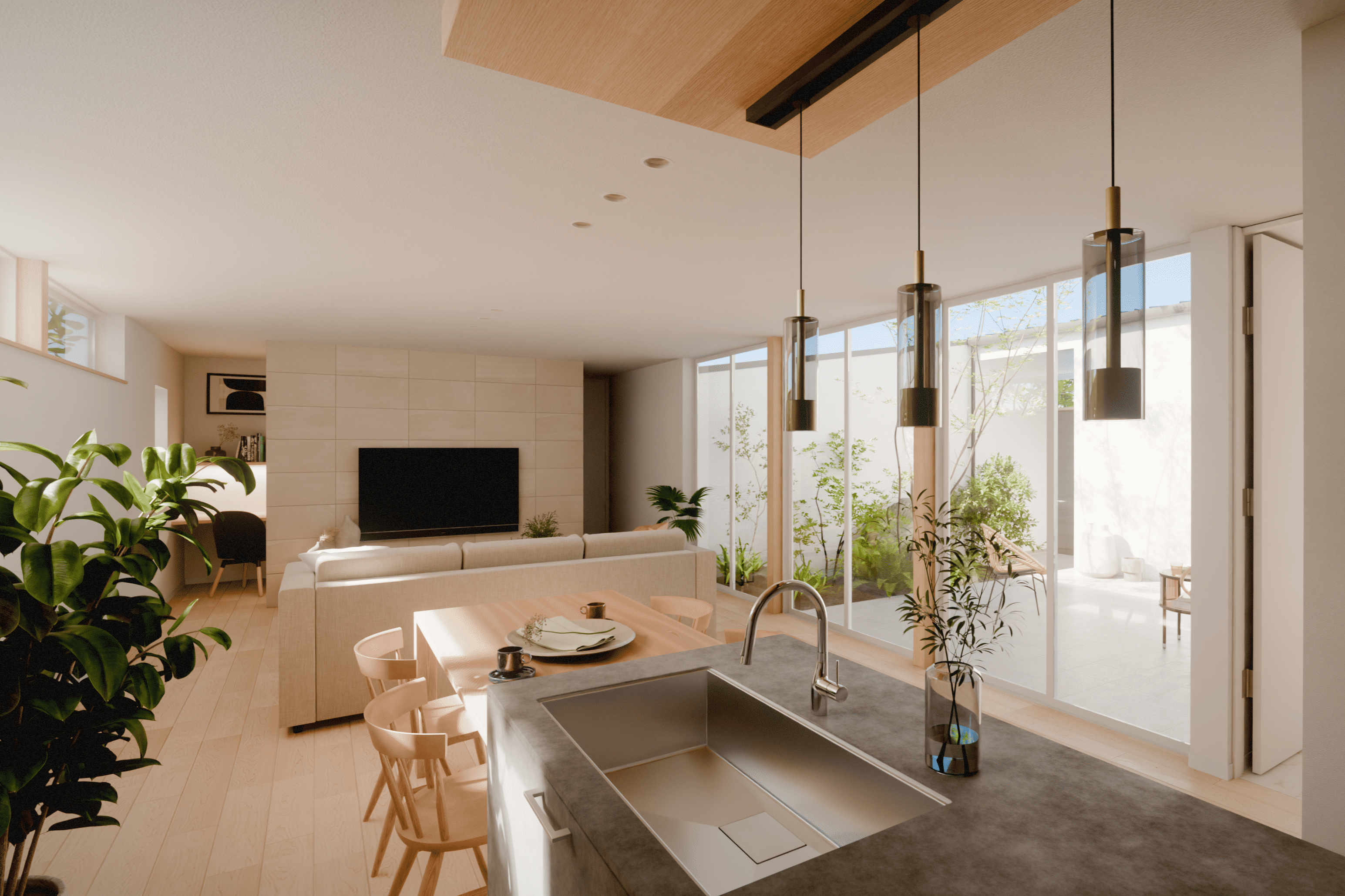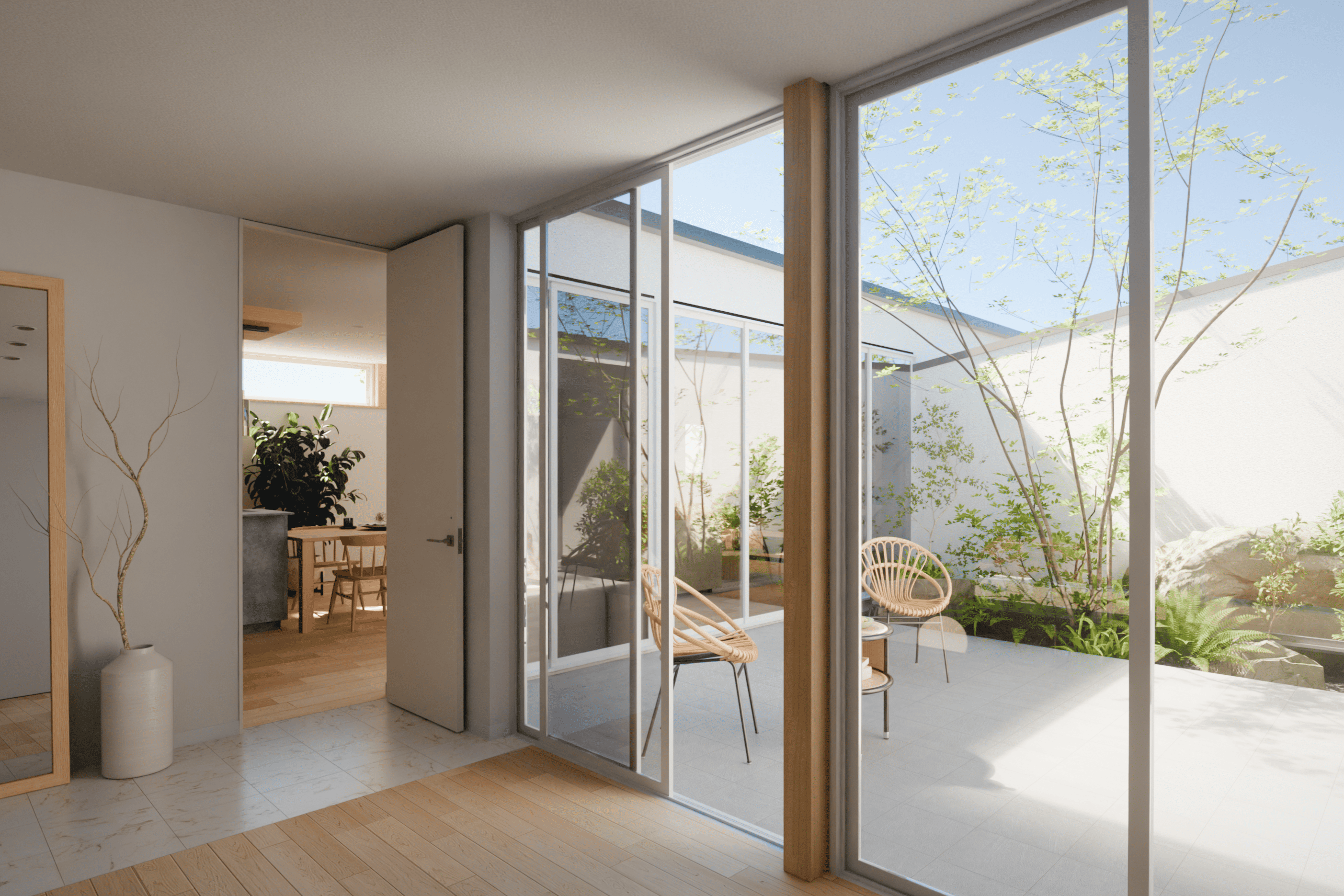 この中庭は、単なる採光のための空間だけでなく、隣地や外部からの視線を遮りながら、外部と一体化したアウター空間としても機能します。同時に、生活動線のコア(中心)に配置することで住まい全体に一体感を与える役割も果たします。