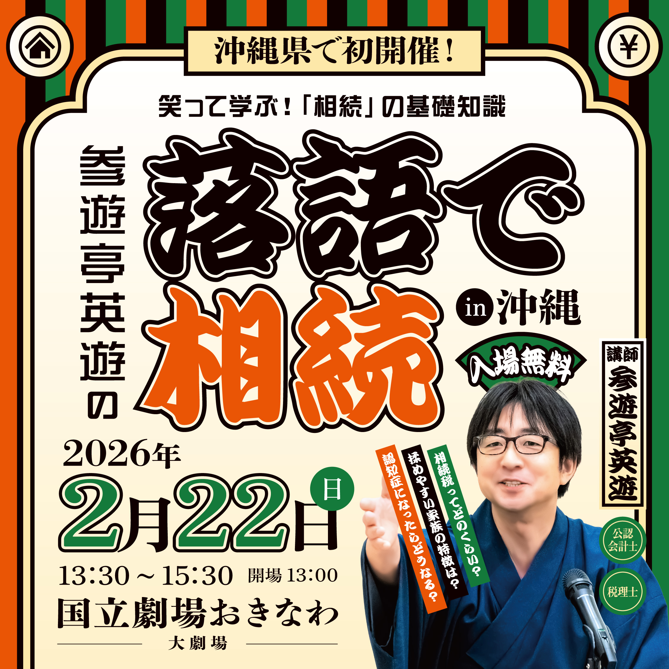 2026年2月22日(日)、沖縄県浦添市の国立劇場おきなわにて、相続・税金の知識を“笑い”で学べるイベント「落語で相続 in 沖縄」を初めて開催いたします。本イベントでは、相続専門の税理士であり社会人落語家の 参遊亭英遊(石倉英樹 氏) が、遺産分け・生前対策・不動産や相続税対策の基本を楽しくわかりやすく解説。入場・個別相談・チェックリスト作成など、すべて無料で体験いただけます。